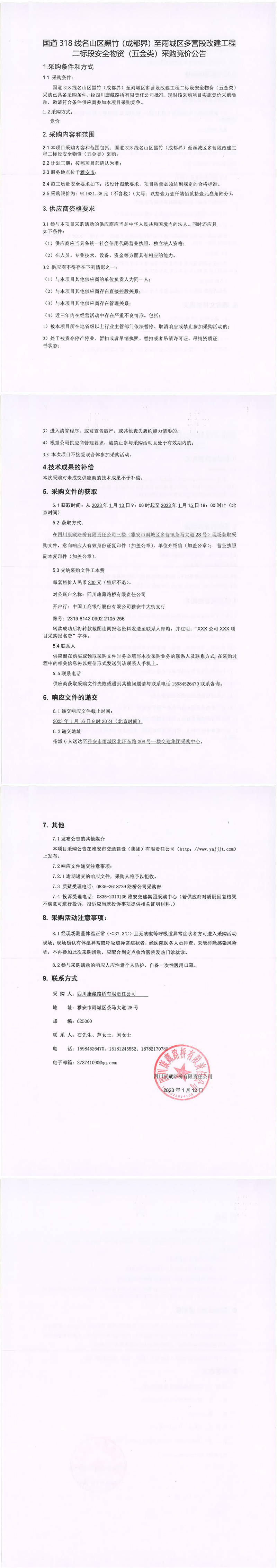 四川康藏路橋有限責(zé)任公司國(guó)道318線名山區(qū)黑竹(成都界)至雨城區(qū)多營(yíng)段改建工程二標(biāo)段安全物資(五金類)采購(gòu)競(jìng)價(jià)公告