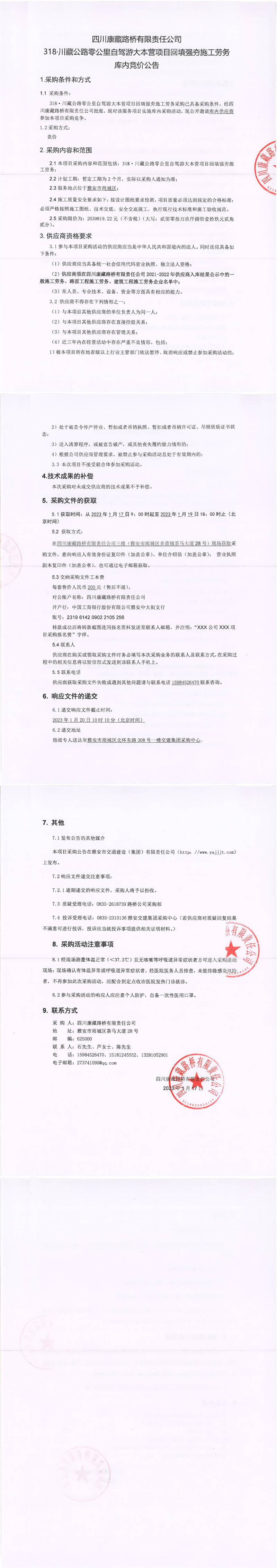 四川康藏路橋有限責(zé)任公司318.川藏公路零公里自駕游大本營項目回填強夯施工勞務(wù)庫內(nèi)競價公告