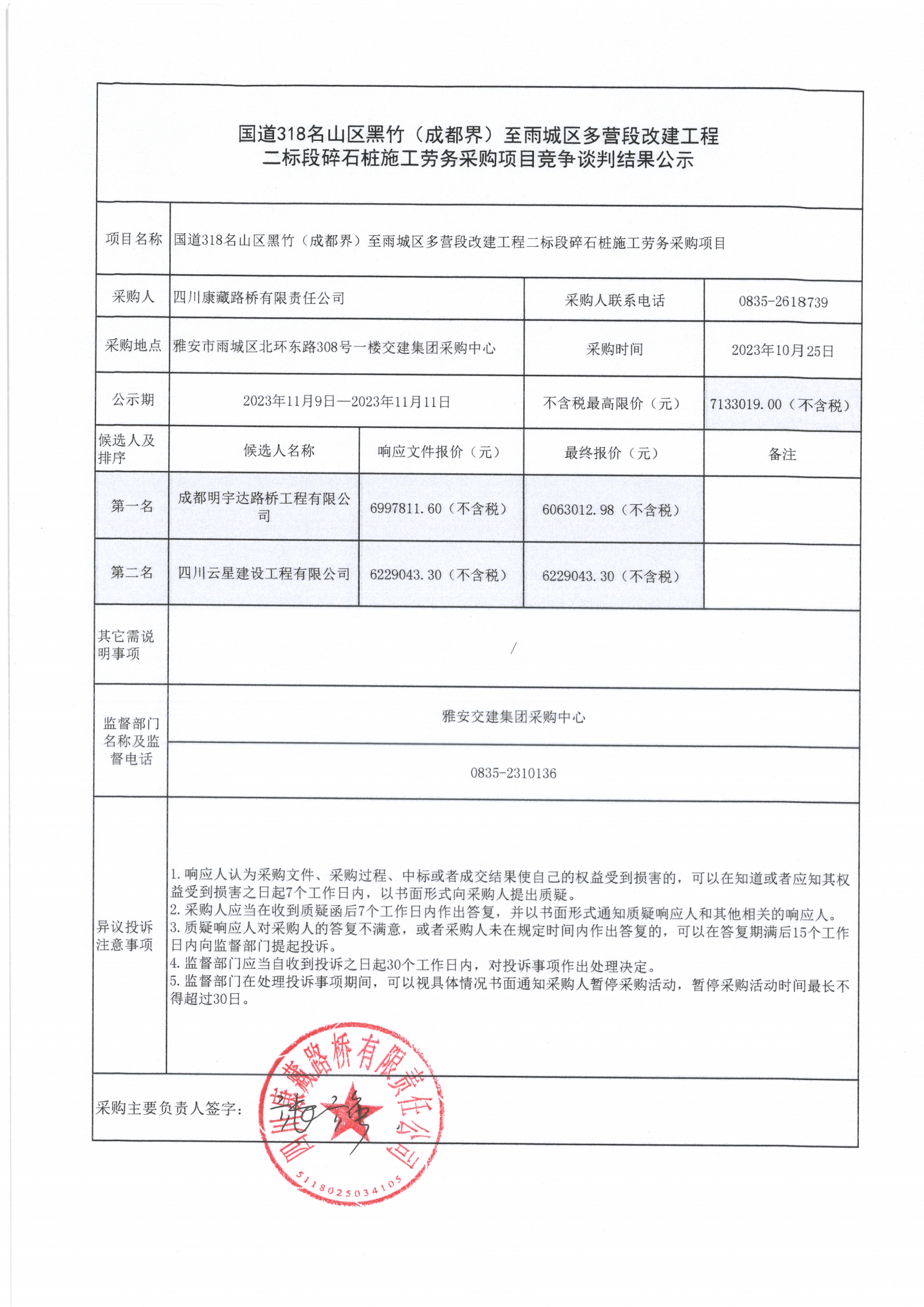 四川康藏路橋有限責(zé)任公司國(guó)道318名山區(qū)黑竹(成都界)至雨城區(qū)多營(yíng)段改建工程二標(biāo)段碎石樁施工勞務(wù)采購(gòu)項(xiàng)目競(jìng)爭(zhēng)談判結(jié)果公示