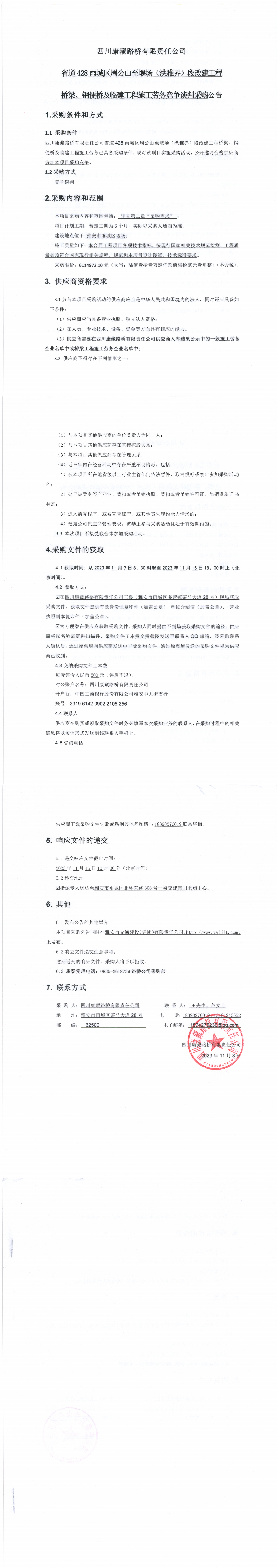 四川康藏路橋有限責任公司省道428雨城區(qū)周公山至堰場(洪雅界)段改建工程橋梁、鋼便橋及臨建工程施工勞務采購公告
