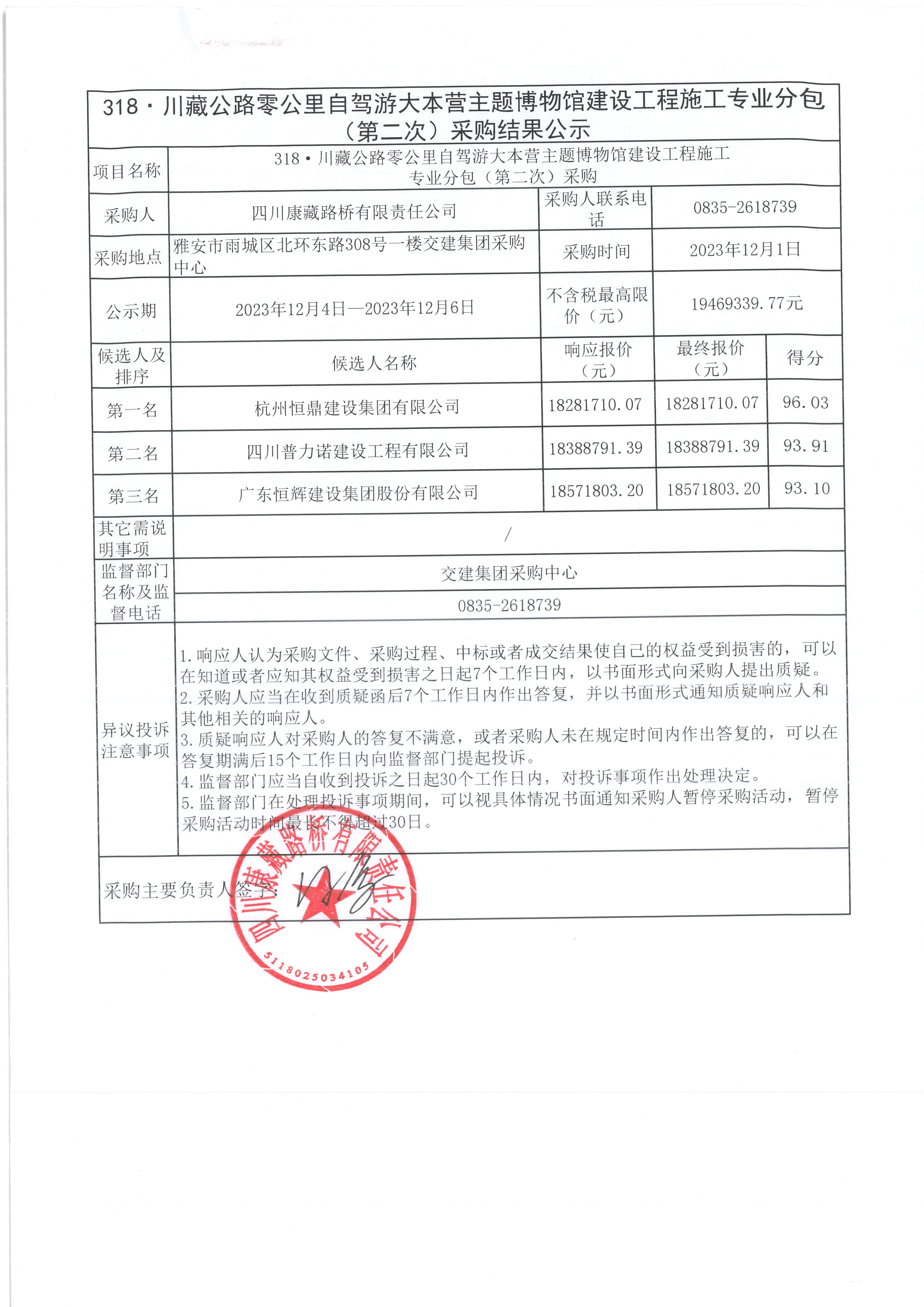 四川康藏路橋有限責任公司318·川藏公路零公里自駕游大本營主題博物館建設工程施工專業(yè)分包 (第二次)采購結果公示
