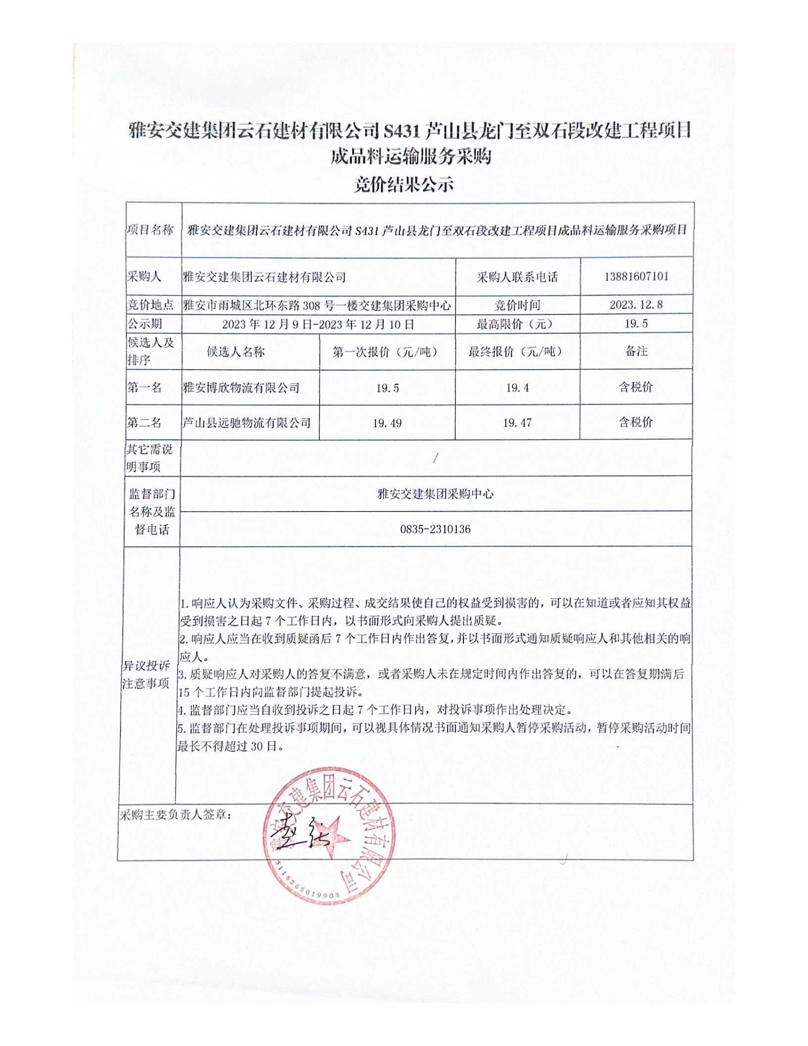 雅安交建集團(tuán)云石建材有限公司S431蘆山縣龍門至雙石段改建工程項目成品料運輸服務(wù)采購競價結(jié)果公示