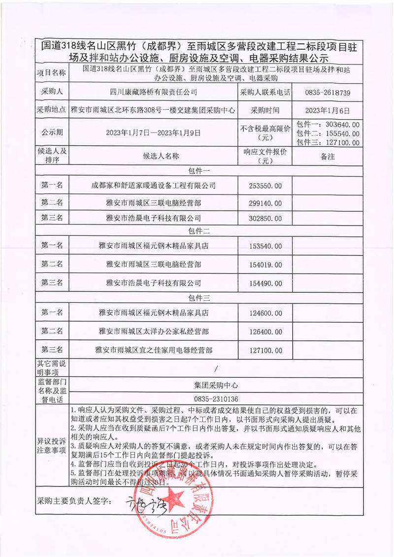 四川康藏路橋有限責(zé)任公司國道318線名山區(qū)黑竹(成都界)至雨城區(qū)多營段改建工程二標段項目駐場及拌和站辦公設(shè)施、廚房設(shè)施及空調(diào)、電器采購結(jié)果公示