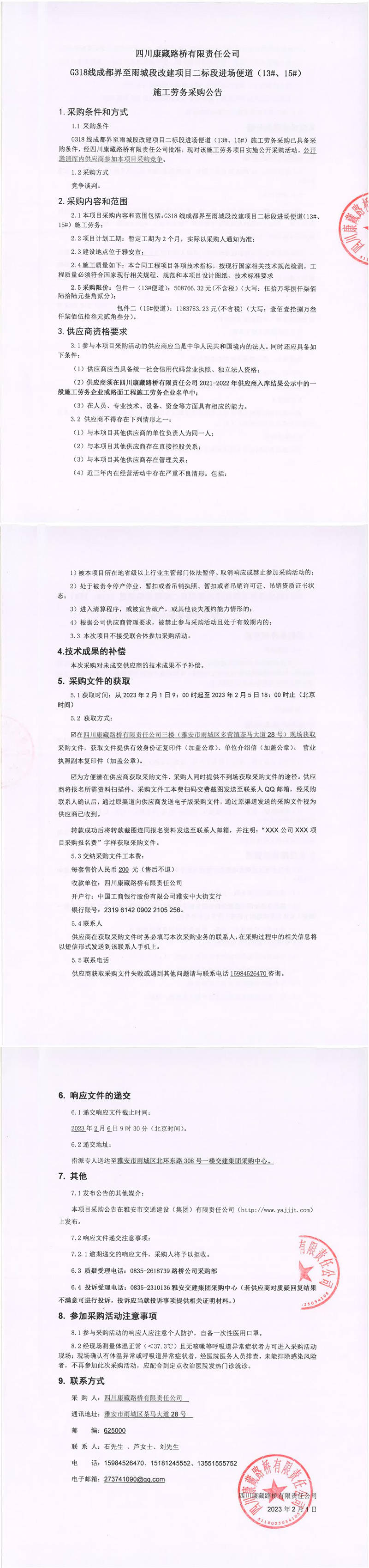 四川康藏路橋有限責(zé)任公司G318線成都界至雨城段改建項(xiàng)目二標(biāo)段進(jìn)場(chǎng)便道(13#、15#)施工勞務(wù)采購公告