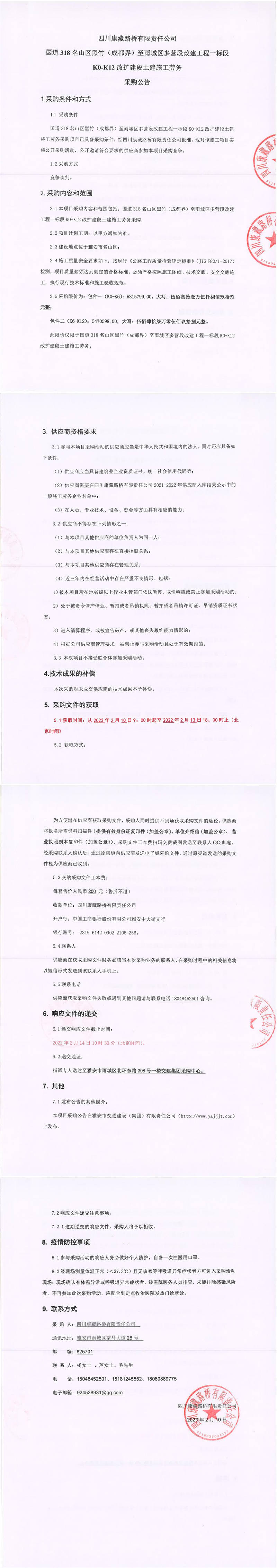 四川康藏路橋有限責(zé)任公司國道318名山區(qū)黑竹(成都界)至雨城區(qū)多營段改建工程一標(biāo)段K0-K12改擴(kuò)建段土建施工勞務(wù)采購公告