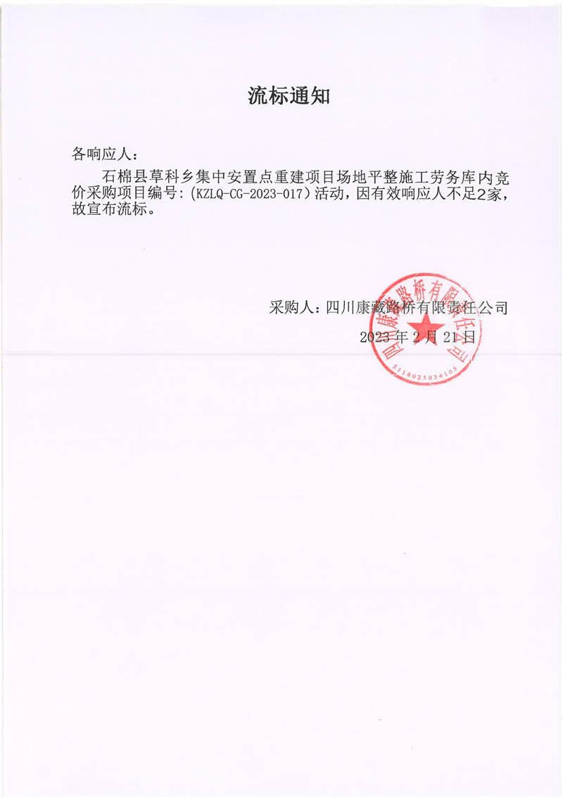 四川康藏路橋有限責任公司石棉草科鄉(xiāng)集中安置點重建項目場地平整施工勞務庫內施工勞務庫內采購流標通知