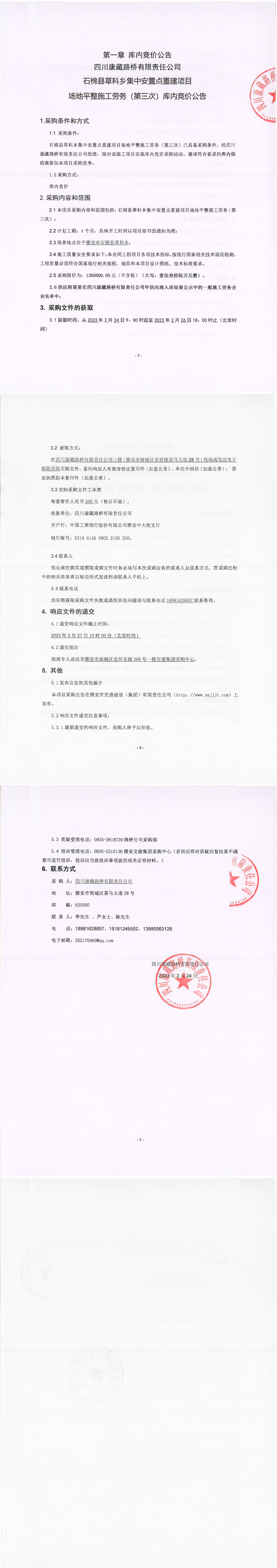 四川康藏路橋有限責(zé)任公司石棉縣草科鄉(xiāng)集中安置點重建項目場地平整施工勞務(wù)(第三次)庫內(nèi)競價