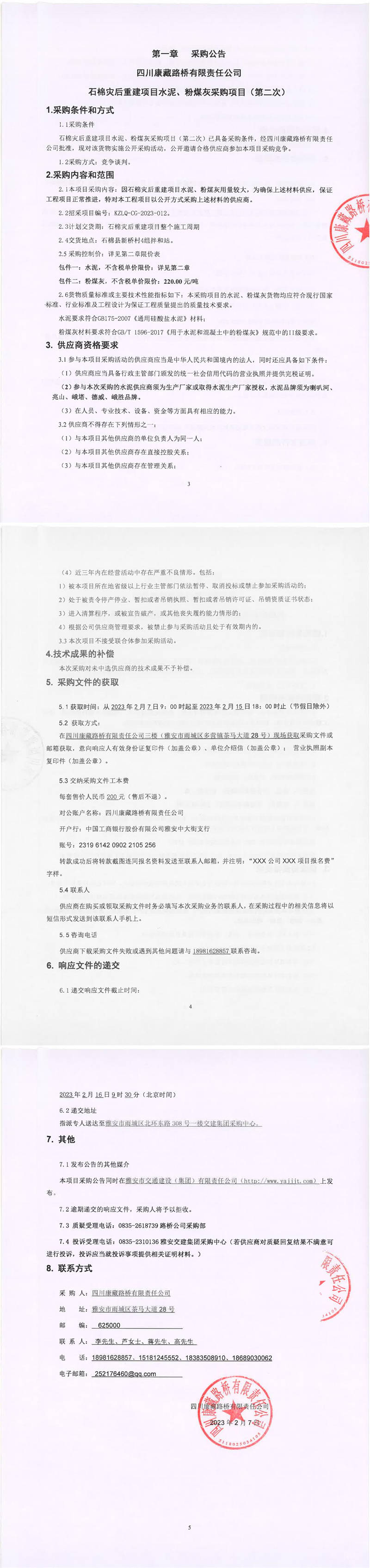 四川康藏路橋有限責任公司石棉災(zāi)重建項目水泥、粉煤灰采購項目(第二次)采購公告