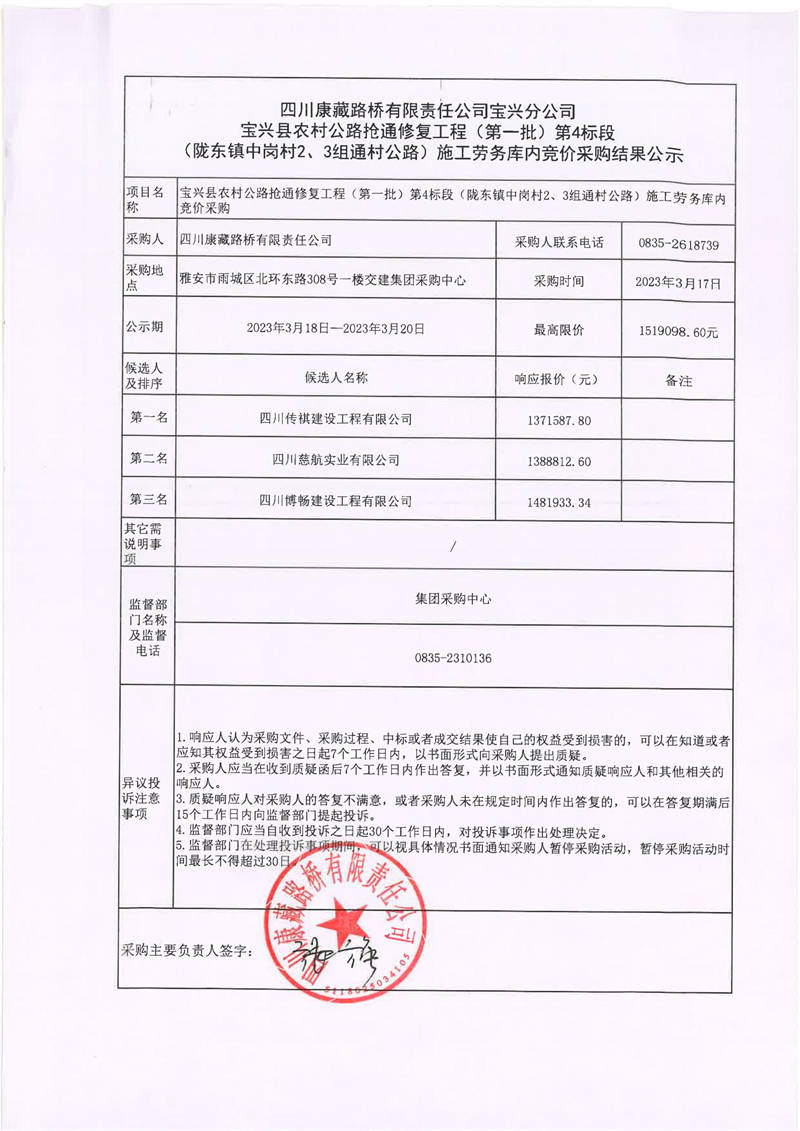 四川康藏路橋有限責(zé)任公司寶興分公司寶興縣農(nóng)村公路搶通修復(fù)工程(第一批)第4標段(隴東鎮(zhèn)中崗村2、3組通村公路)施工勞務(wù)庫內(nèi)競價采購結(jié)果公示