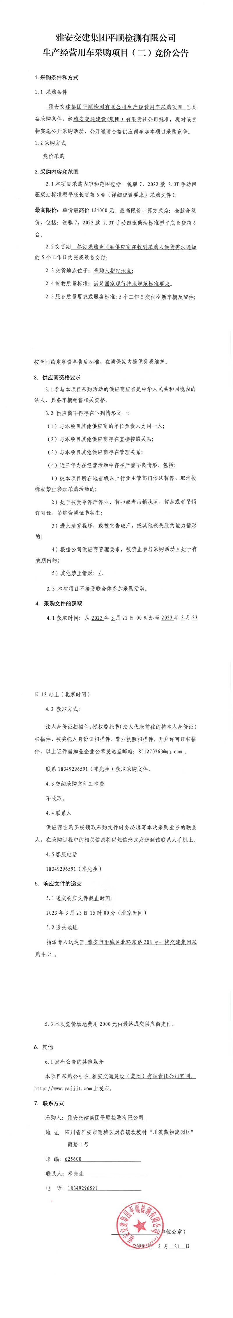 雅安交建集團(tuán)平順檢測(cè)有限公司平順公司生產(chǎn)經(jīng)營(yíng)用車(chē)采購(gòu)項(xiàng)目(二)競(jìng)價(jià)公告
