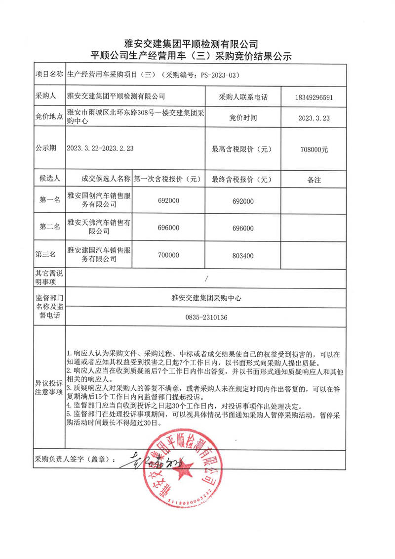 雅安交建集團平順檢測有限公司平順公司生產(chǎn)經(jīng)營用車(三)采購競價結果公示