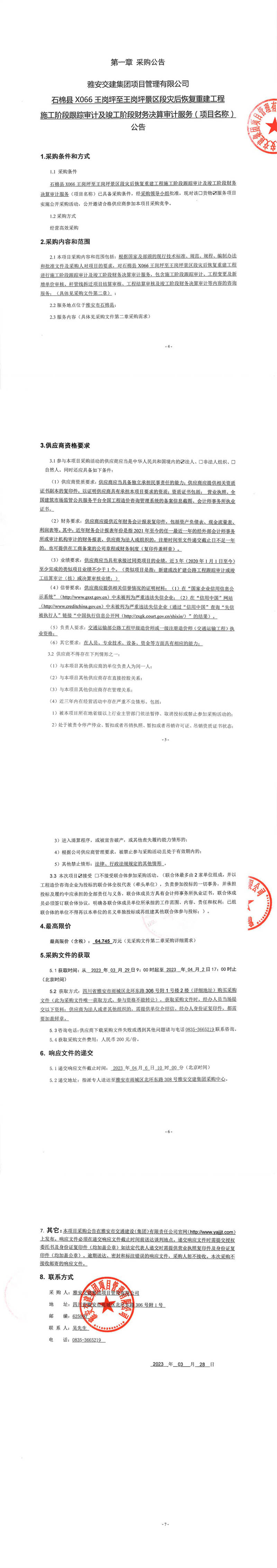 雅安交建集團(tuán)項(xiàng)目管理有限公司石棉縣X066王崗坪至王崗坪景區(qū)段災(zāi)后恢復(fù)重建工程施工階段跟蹤審計(jì)及竣工階段財(cái)務(wù)決算審計(jì)服務(wù)(項(xiàng)目名稱)公告
