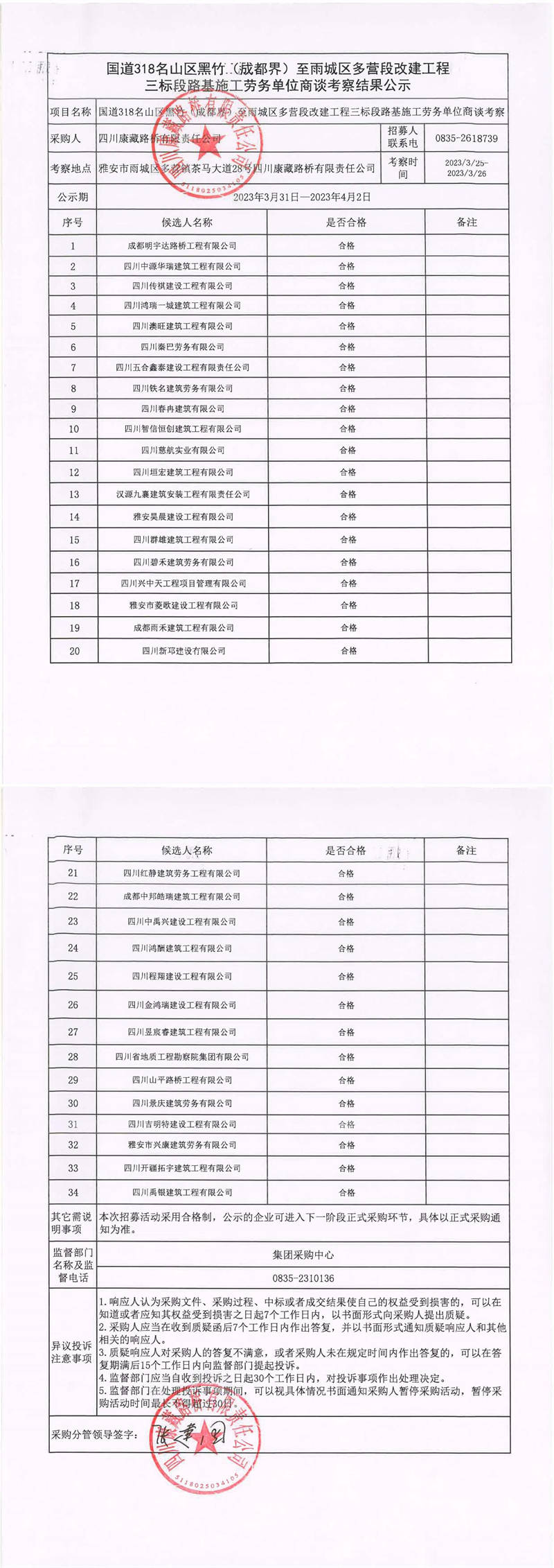 四川康藏路橋有限責(zé)任公司國道318名山區(qū)黑竹(成都界)至雨城區(qū)多營段改建工程三標(biāo)段橋梁施工勞務(wù)單位商談考察結(jié)果公示