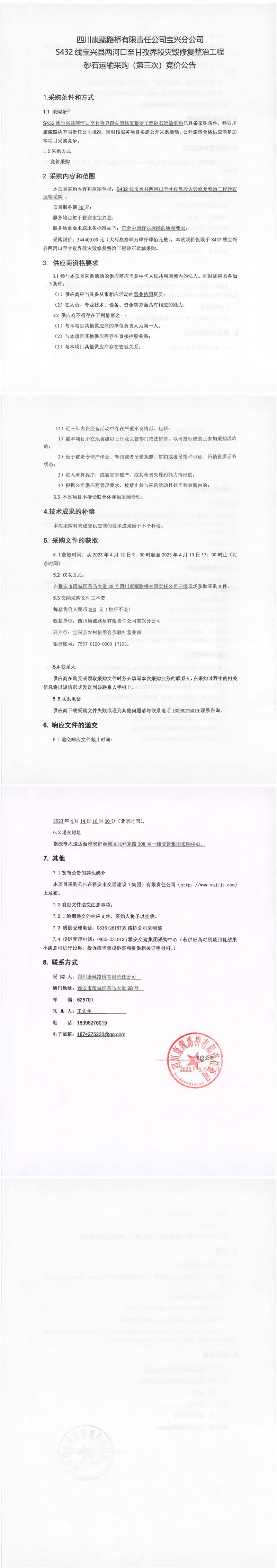四川康藏路橋有限責(zé)任公司寶興分公司S432寶興縣兩河口至甘孜界段災(zāi)毀修復(fù)整治工程砂石運(yùn)輸采購(gòu)(第三次)競(jìng)價(jià)公告