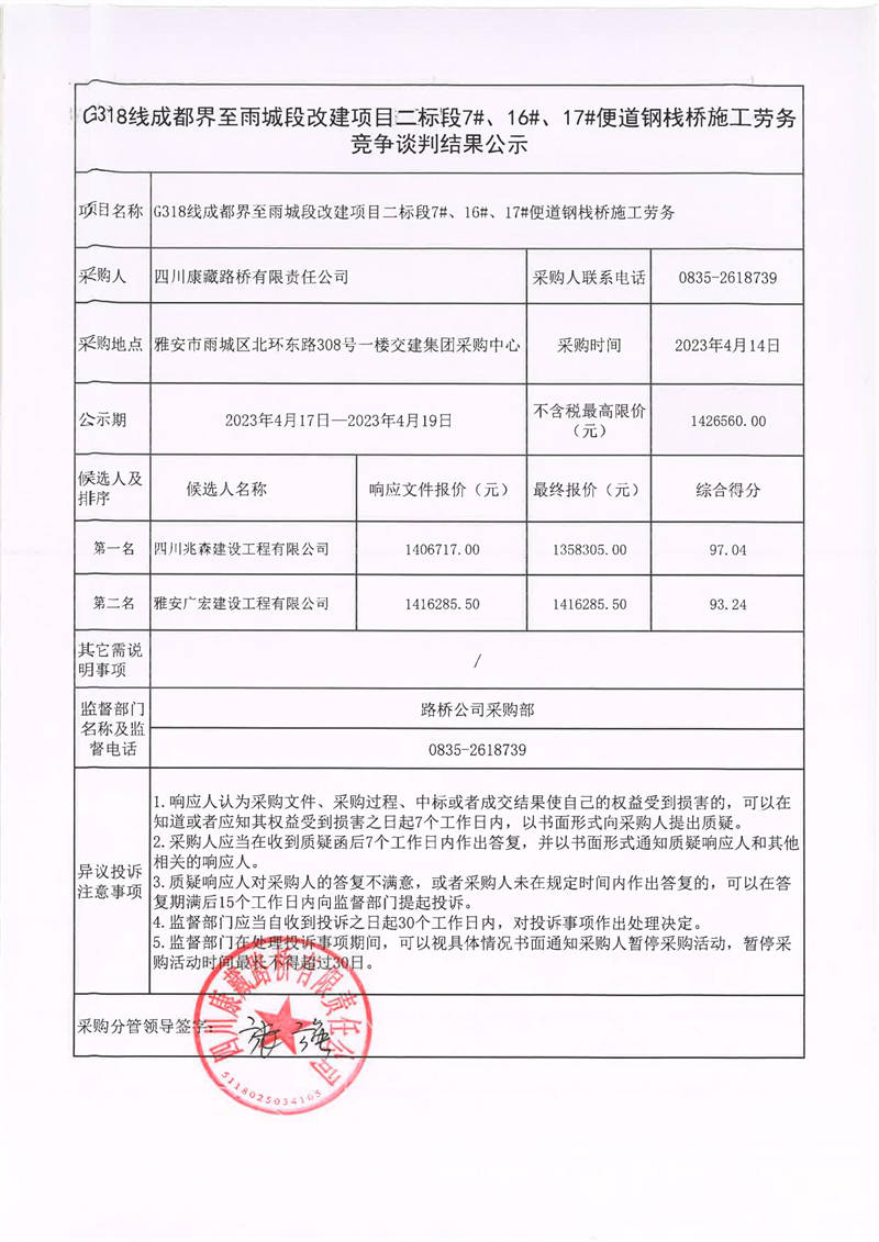 四川康藏路橋有限責(zé)任公司G318線成都至雨城段改建項(xiàng)目二標(biāo)段7#、16#、17#便道鋼棧橋施工勞務(wù)競(jìng)爭(zhēng)談判結(jié)果公示