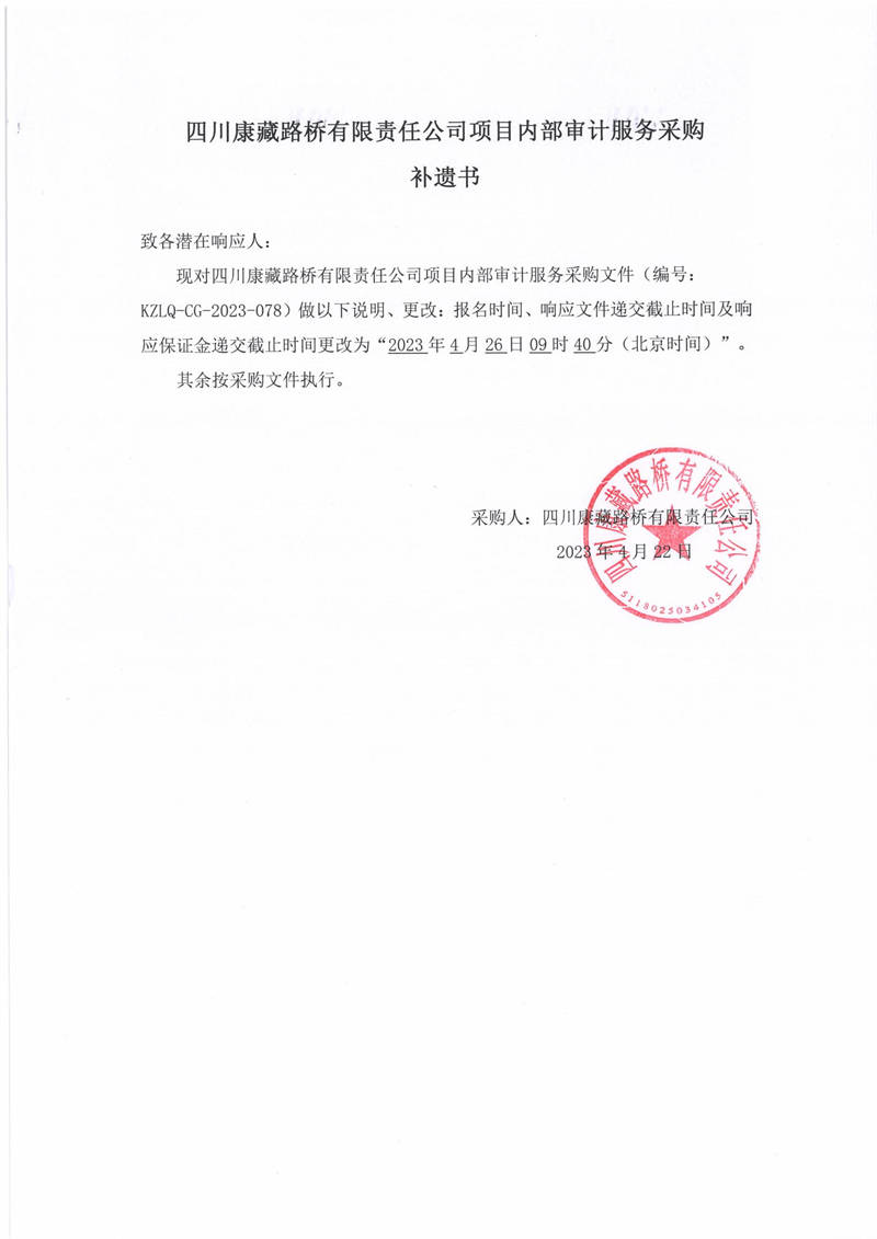 四川康藏路橋有限責任公司項目內(nèi)部審計服務采購補遺書