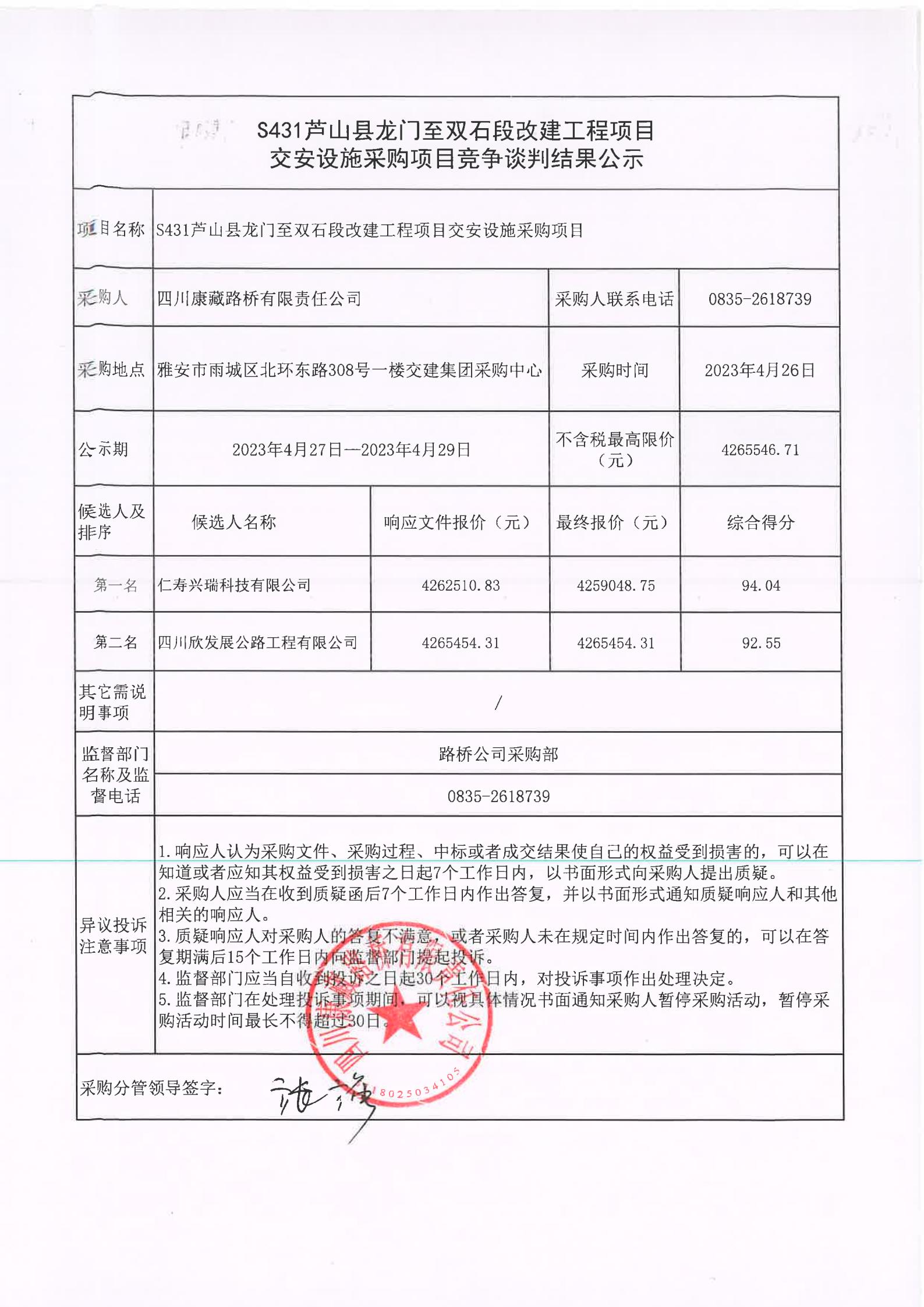 四川康藏路橋有限責(zé)任公司S431蘆山縣龍門至雙石段改建工程項(xiàng)目交安設(shè)施采購(gòu)項(xiàng)目競(jìng)爭(zhēng)談判結(jié)果公示