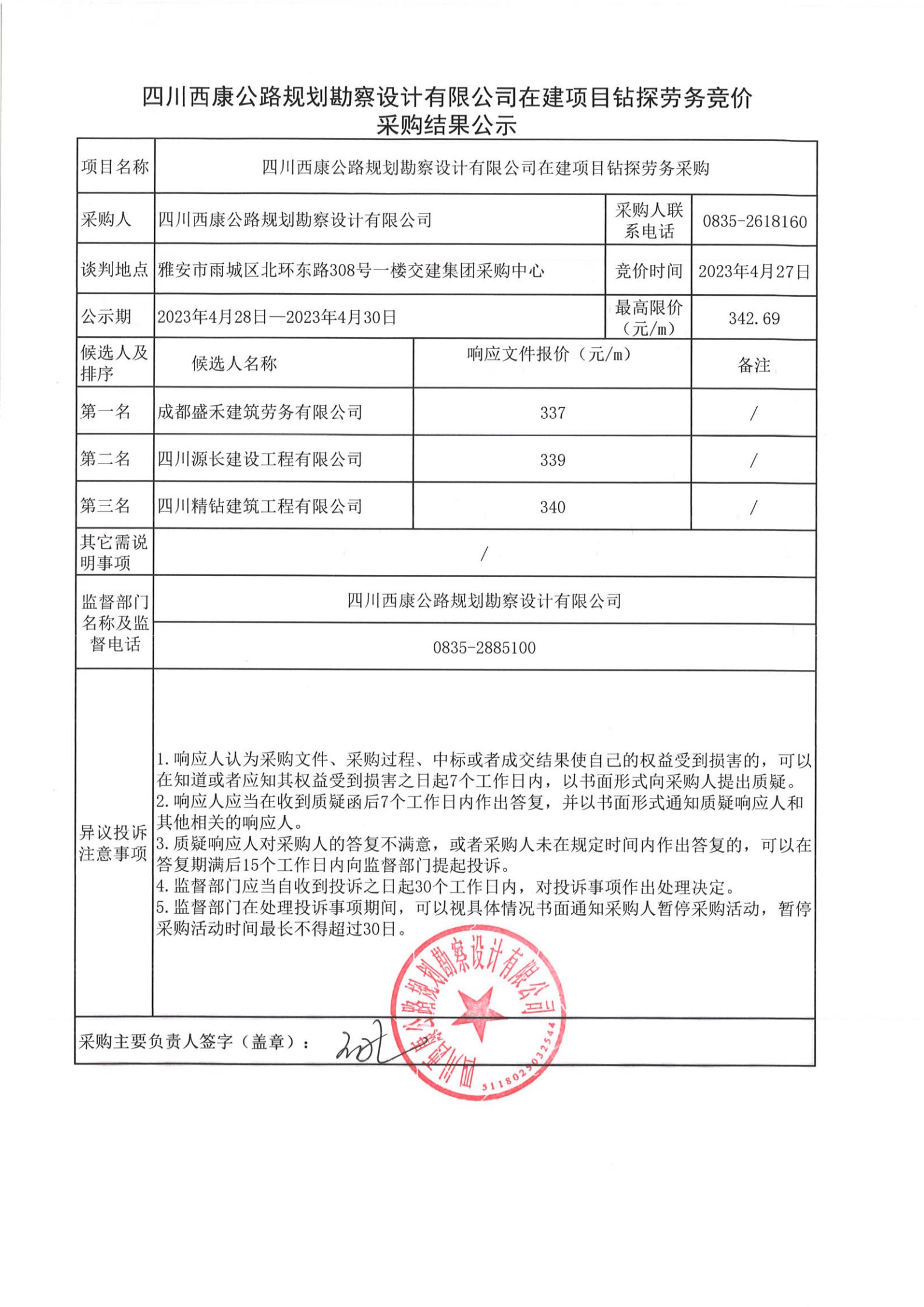 四川西康公路規(guī)劃勘察設計公司在建項目鉆探勞務競價采購結果公示