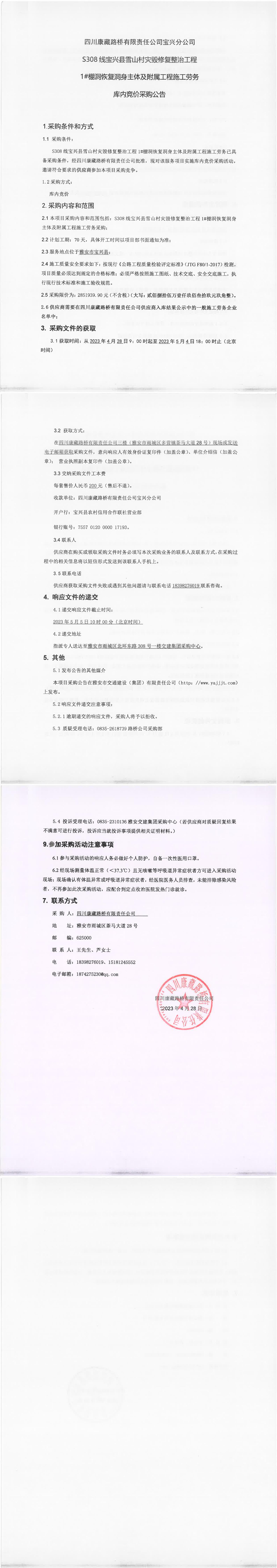 四川康藏路橋有限責(zé)任公司寶興分公司S308線寶興縣雪山村段災(zāi)毀修復(fù)整治工程1#棚洞恢復(fù)洞身主體及附屬工程施工勞務(wù)庫內(nèi)競價采購公告