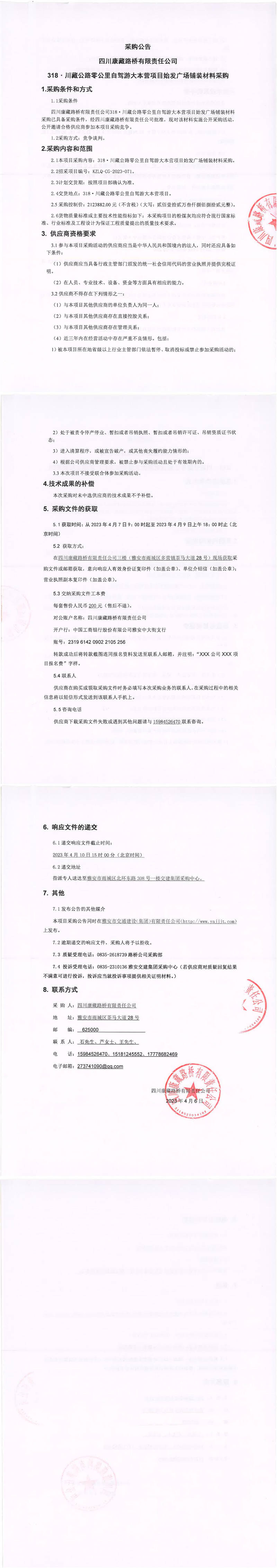 四川康藏路橋有限責(zé)任公司318·川藏公路零公里自駕游大本營項(xiàng)目始發(fā)廣場鋪裝材料采購公告
