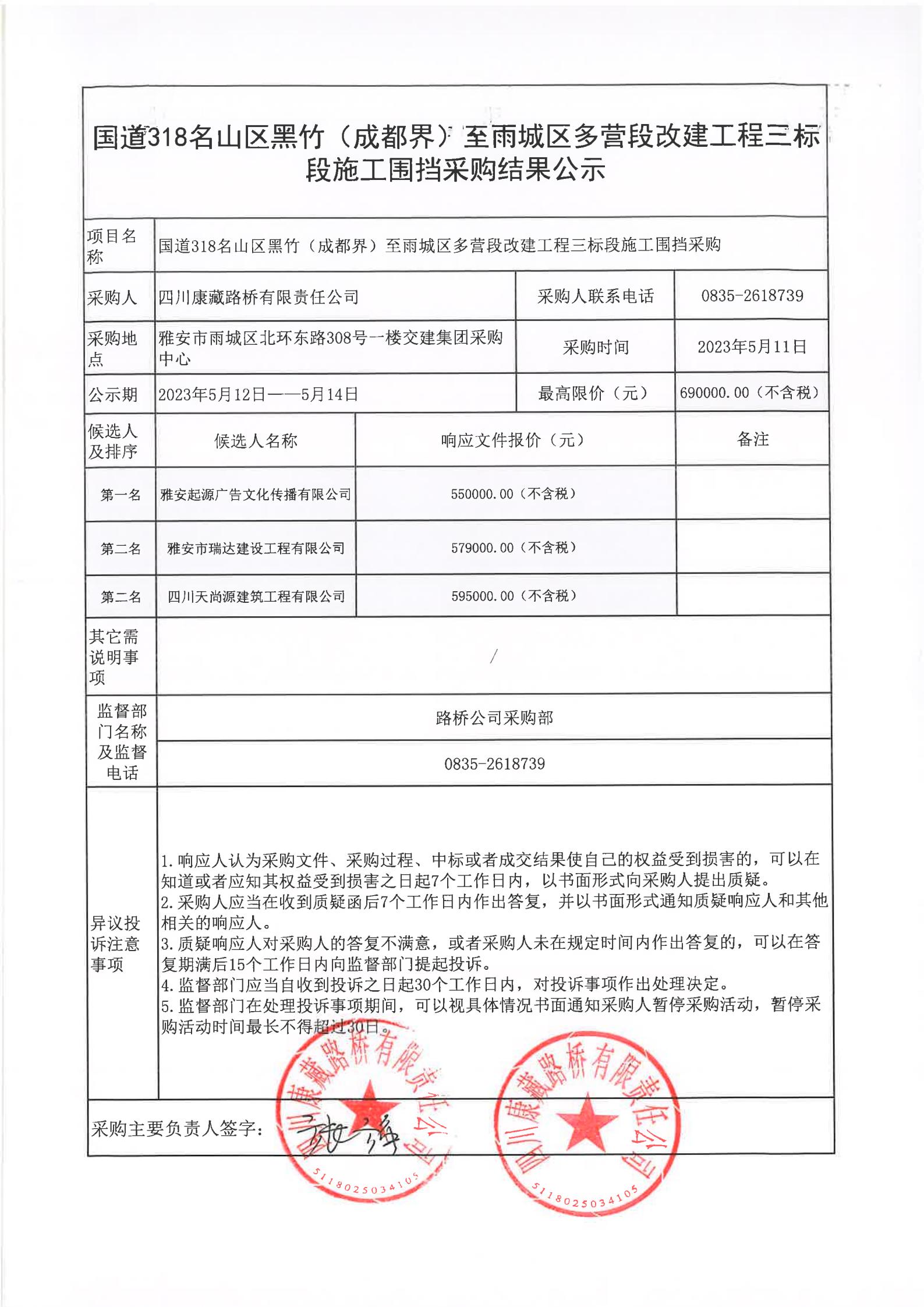 四川康藏路橋有限責任公司國道318名山區(qū)黑竹(成都界)至雨城區(qū)多營段改建工程三標段施工圍擋采購結(jié)果公示