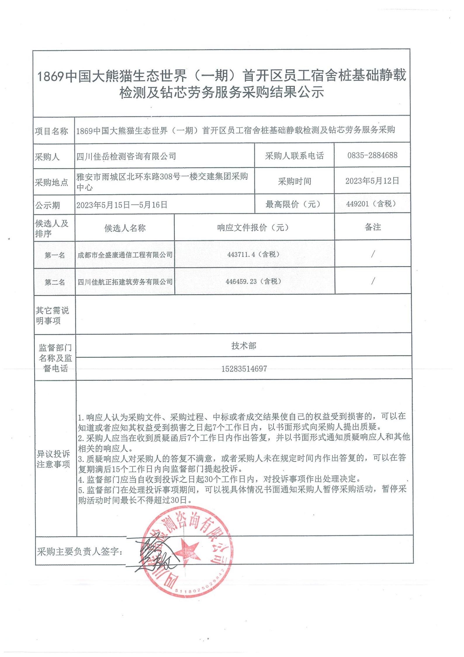 四川佳岳檢測咨詢有限公司關(guān)于1869中國大熊貓生態(tài)世界(一期)首開區(qū)員工宿舍樁基礎(chǔ)靜載檢測勞務(wù)及鉆芯項(xiàng)目中標(biāo)結(jié)果公示