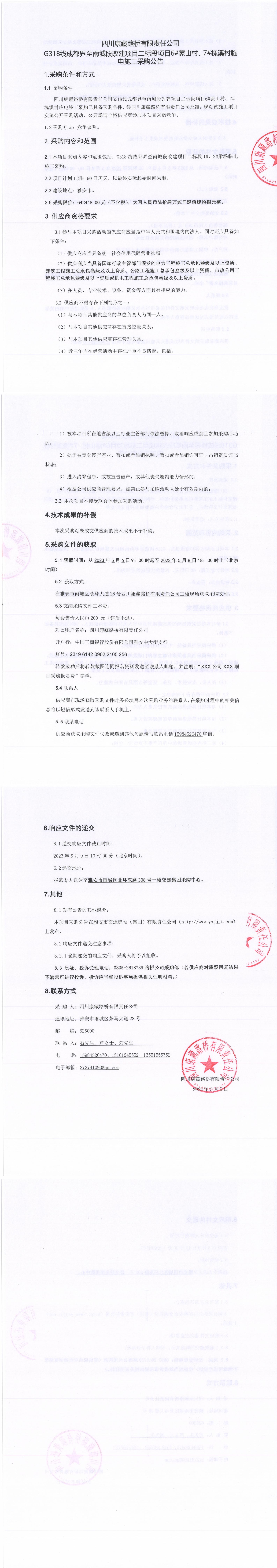 四川康藏路橋有限責(zé)任公司G318線成都至雨城段改建項目二標(biāo)段項目6#蒙山村、7#槐溪村臨時電施工采購公告