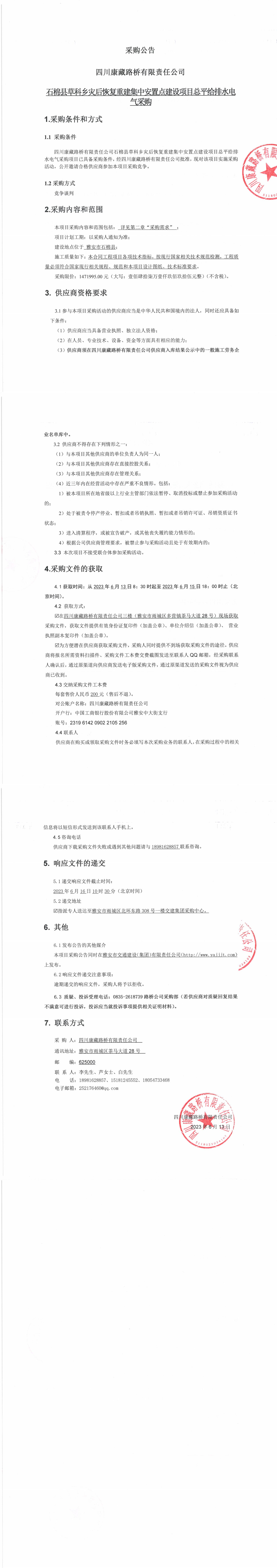 四川康藏路橋有限責任公司石棉縣草科鄉(xiāng)災后恢復重建集中安置點建設項目總平給排水電器采購公告