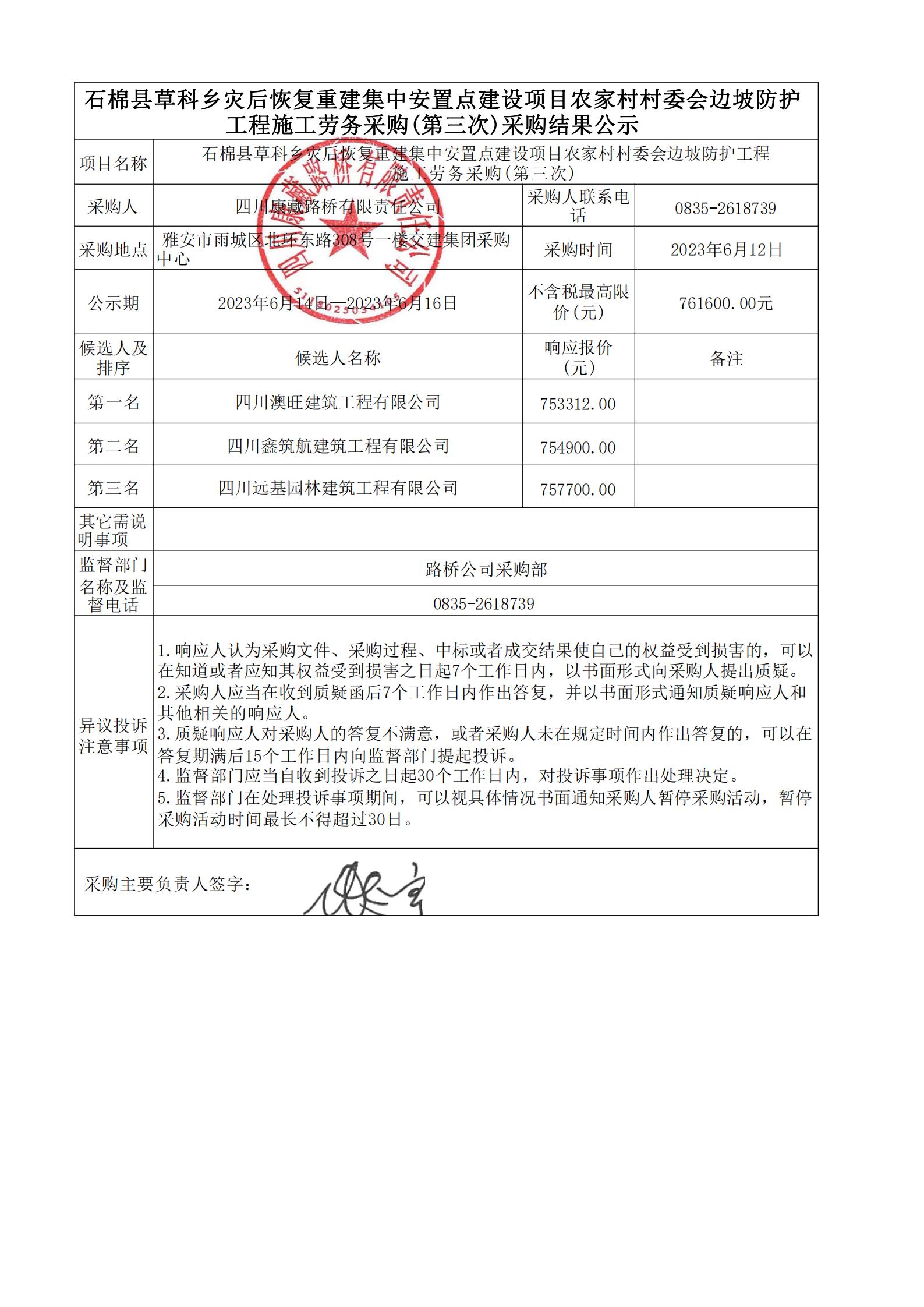 四川康藏路橋有限責(zé)任公司石棉縣草科鄉(xiāng)災(zāi)后恢復(fù)重建集中安置點(diǎn)建設(shè)項(xiàng)目農(nóng)家村村委會邊坡防護(hù)工程施工勞務(wù)采購(第三次)結(jié)果公示