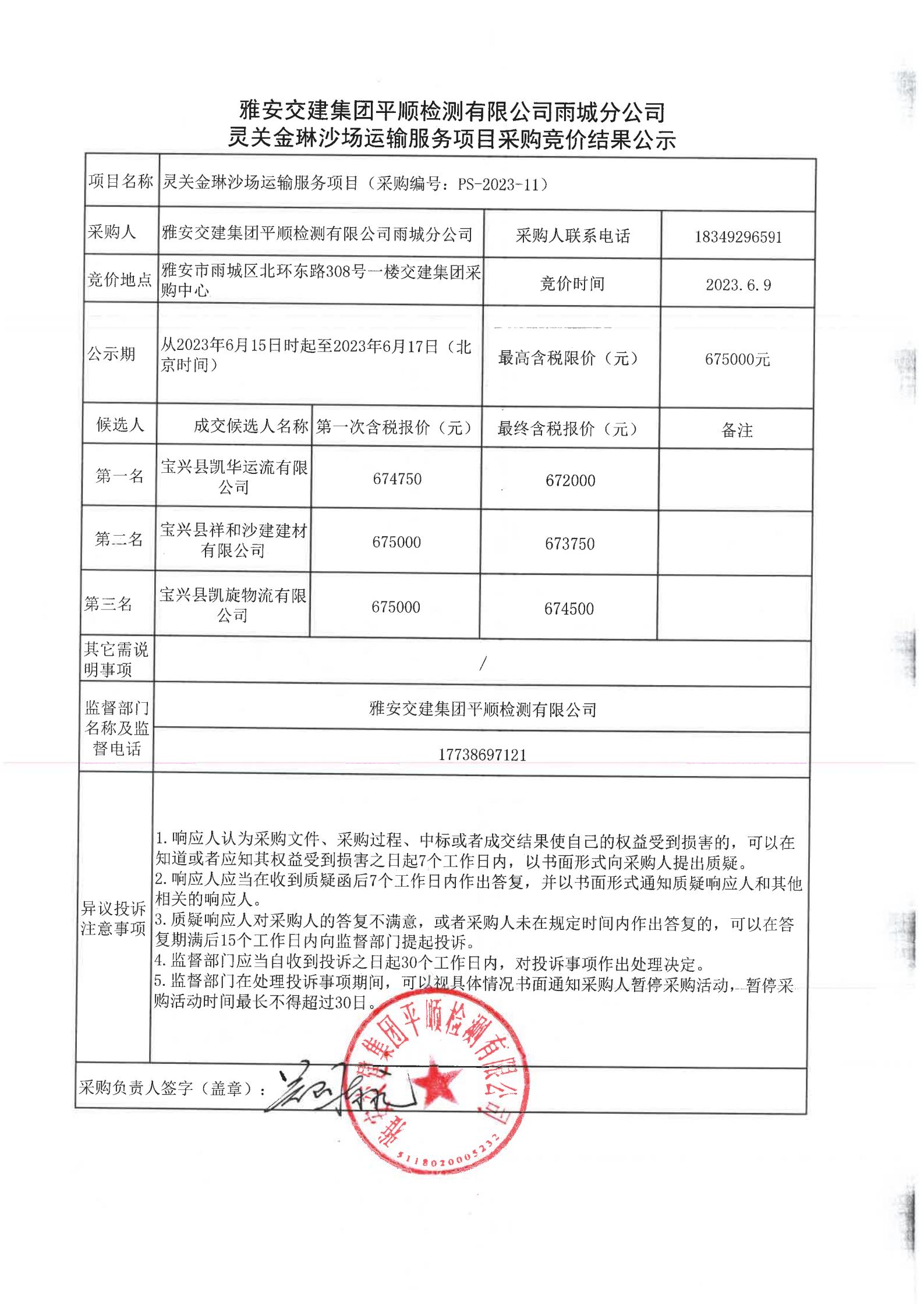 雅安交建集團平順檢測有限公司雨城分公司靈關金琳沙場運輸服務競價結果公示