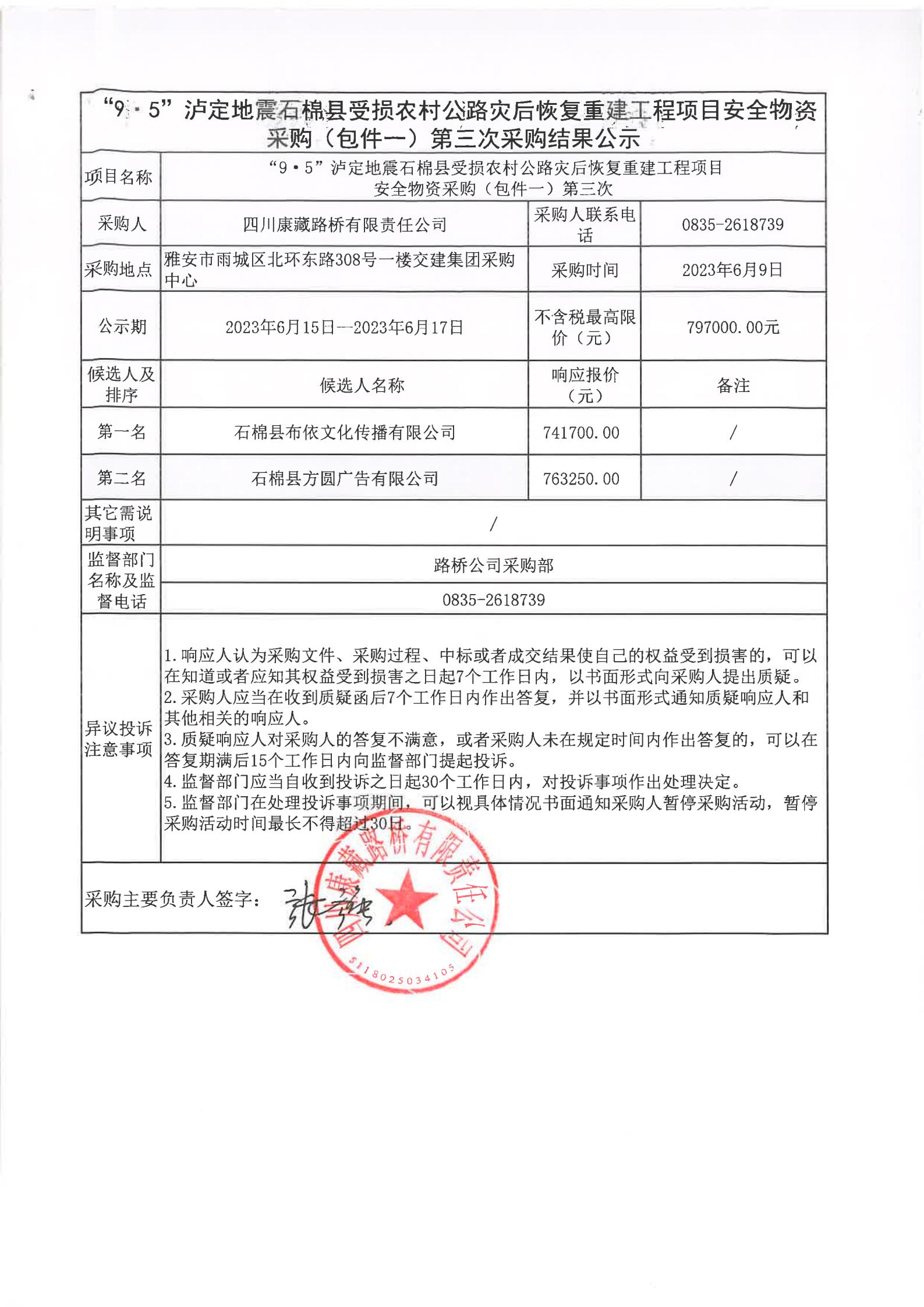 四川康藏路橋有限責(zé)任公司“9·5”瀘定地震石棉縣農(nóng)村公路災(zāi)后恢復(fù)重建工程項(xiàng)目安全物資采購(包件一)第三次采購結(jié)果公示