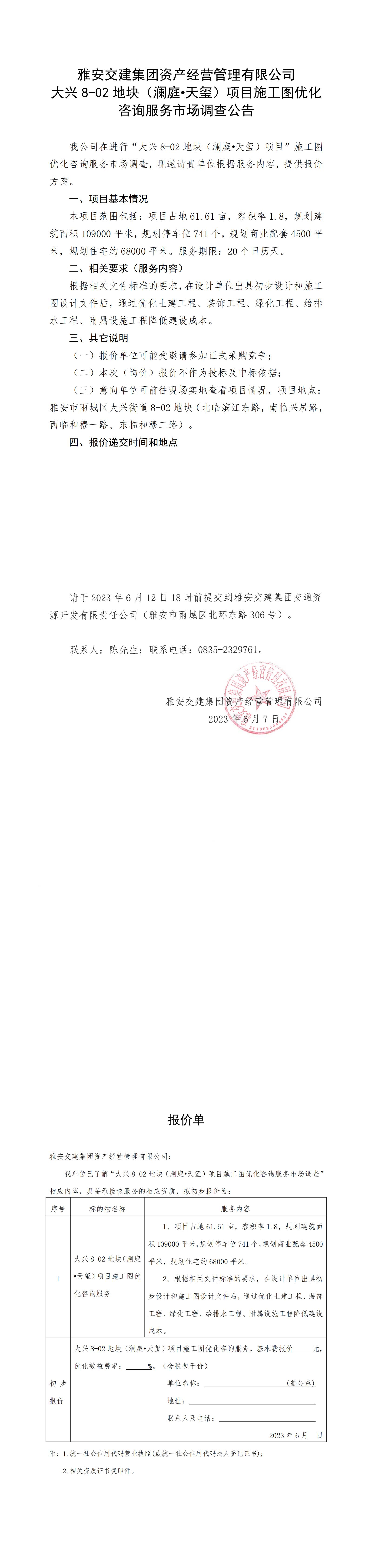 雅安交建集團資產經營管理有限公司大興8-02地塊(瀾庭·天璽)項目施工圖優(yōu)化咨詢服務市場調查公告