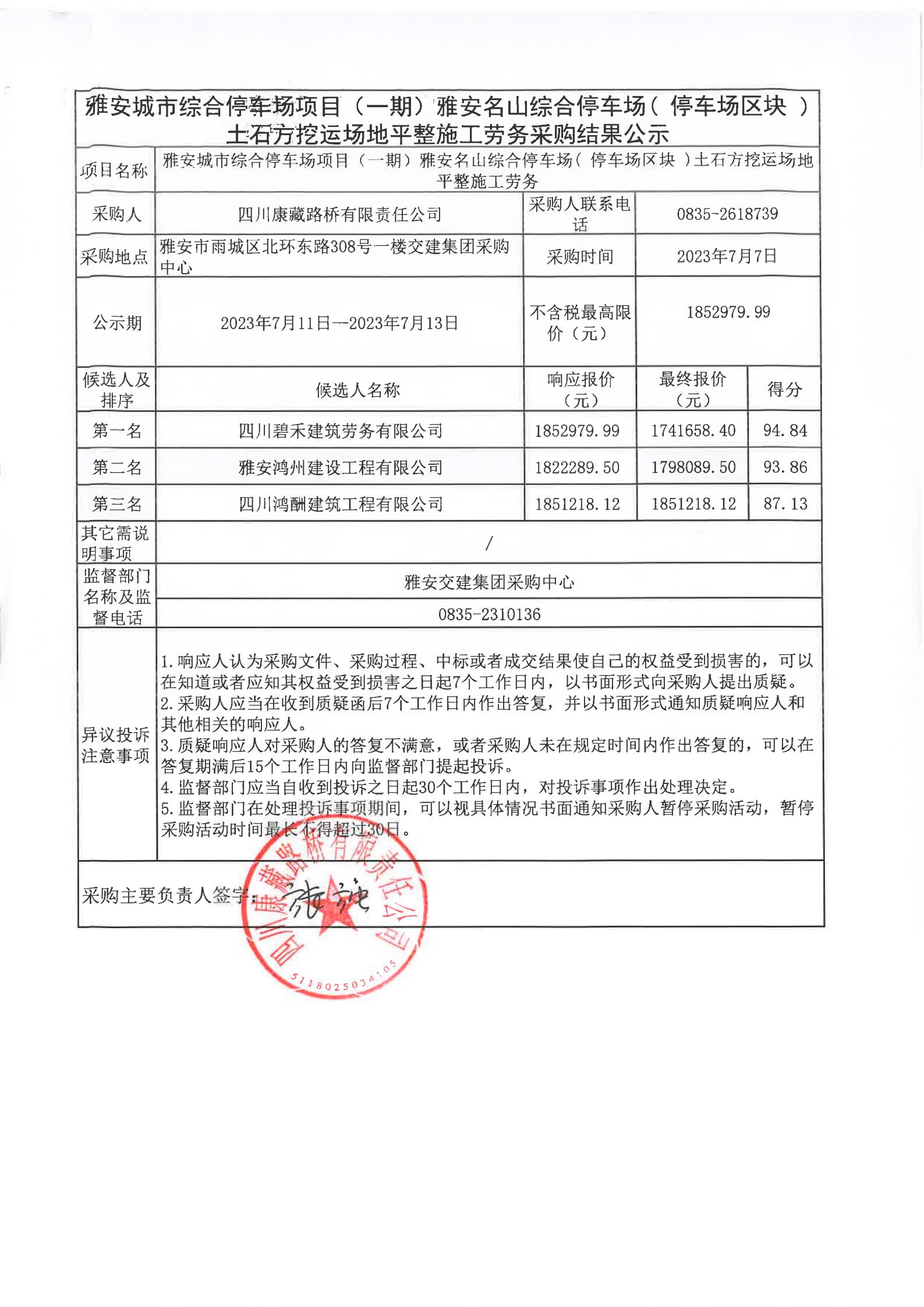四川康藏路橋有限責(zé)任公司雅安城市綜合停車場項目(一期)雅安名山綜合停車場(停車場區(qū)塊)土石方挖運場地平整施工勞務(wù)采購結(jié)果公示