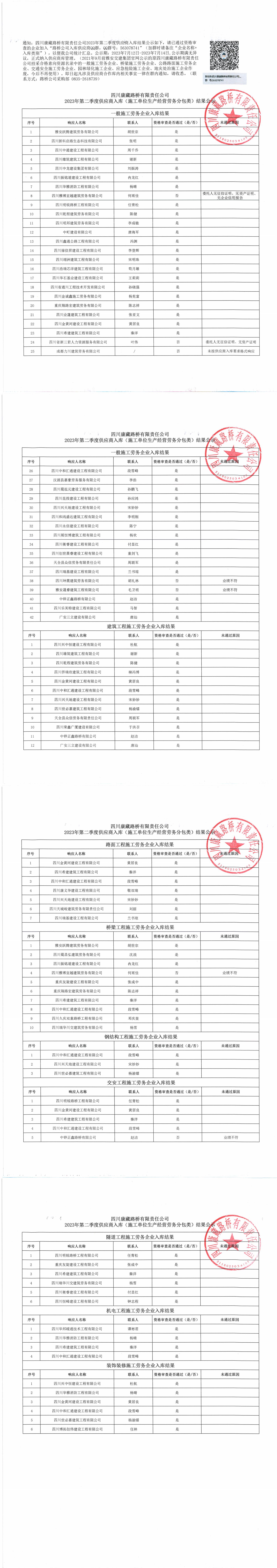 四川康藏路橋有限責任公司2023年第二季度供應商入庫(施工單位生產(chǎn)經(jīng)營勞務分包類)結果公示