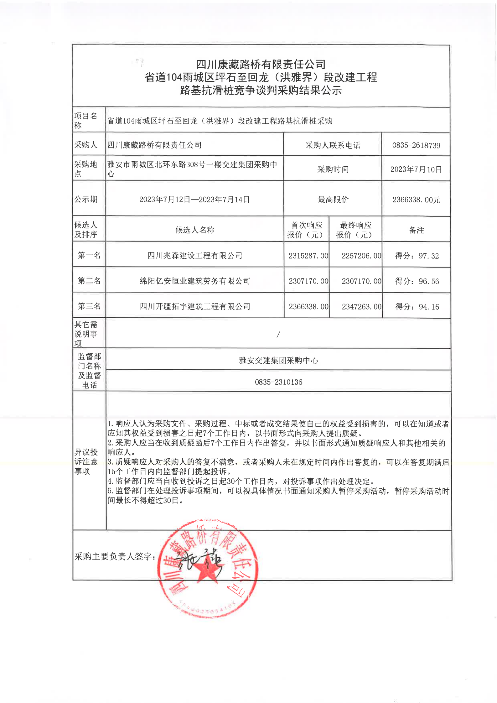 四川康藏路橋有限責(zé)任公司省道104雨城區(qū)坪石至回龍(洪雅界)段改建工程路基抗滑樁競爭談判采購結(jié)果公示