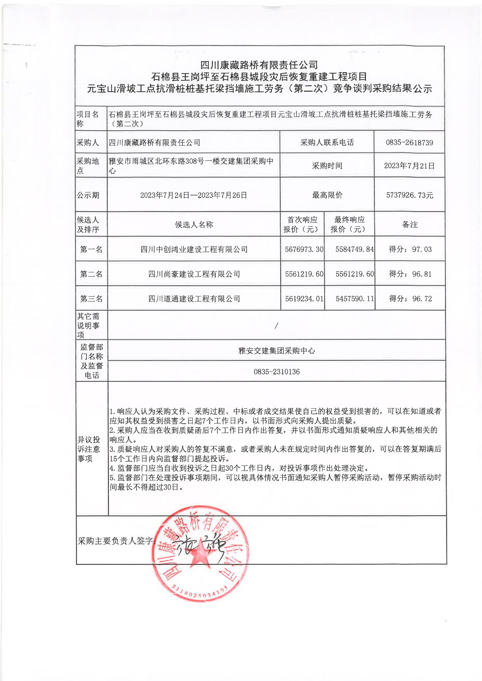 四川康藏路橋有限責(zé)任公司石棉縣王崗坪至石棉縣城段災(zāi)后恢復(fù)重建工程項(xiàng)目元寶山滑坡工點(diǎn)抗滑樁樁基托梁擋墻施工勞務(wù)(第二次)競(jìng)爭(zhēng)談判采購(gòu)結(jié)果公示