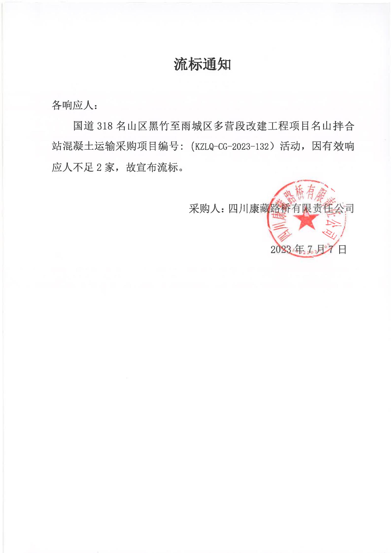 四川康藏路橋有限責(zé)任公司國道318名山區(qū)黑竹(成都界)至雨城區(qū)多營段改建工程項目名山拌合站混凝土運(yùn)輸采購流標(biāo)通知