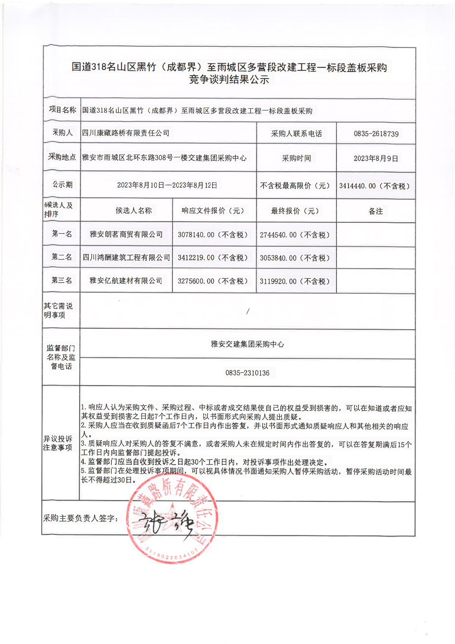 四川康藏路橋有限責(zé)任公司國(guó)道318名山區(qū)黑竹(成都界)至雨城區(qū)多營(yíng)段改建工程一標(biāo)段蓋板采購(gòu)競(jìng)爭(zhēng)談判結(jié)果公示