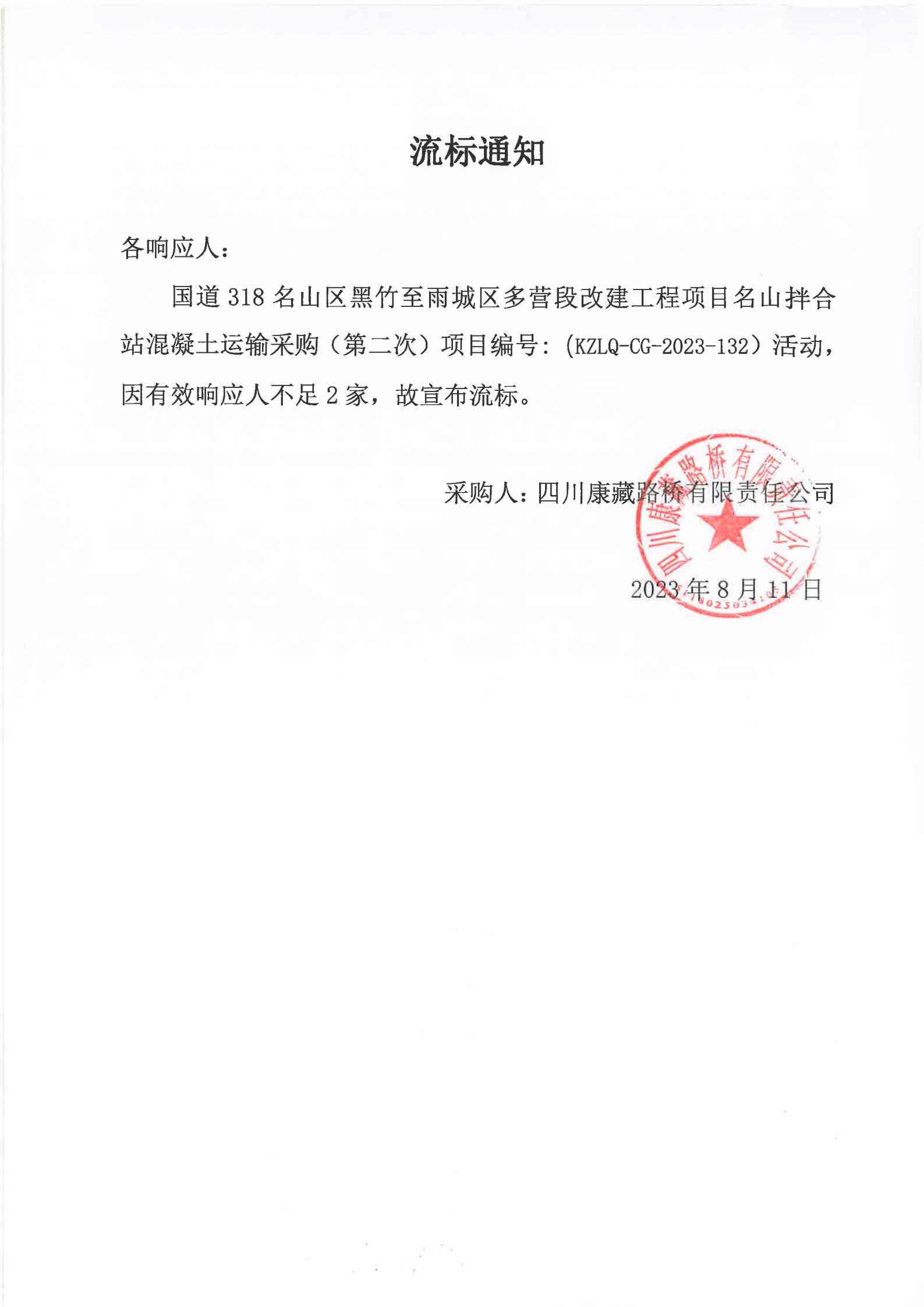 四川康藏路橋有限責任公司國道318名山區(qū)黑竹至雨城區(qū)多營段改建工程項目名山拌合站混凝土運輸服務(第二次)流標通知)