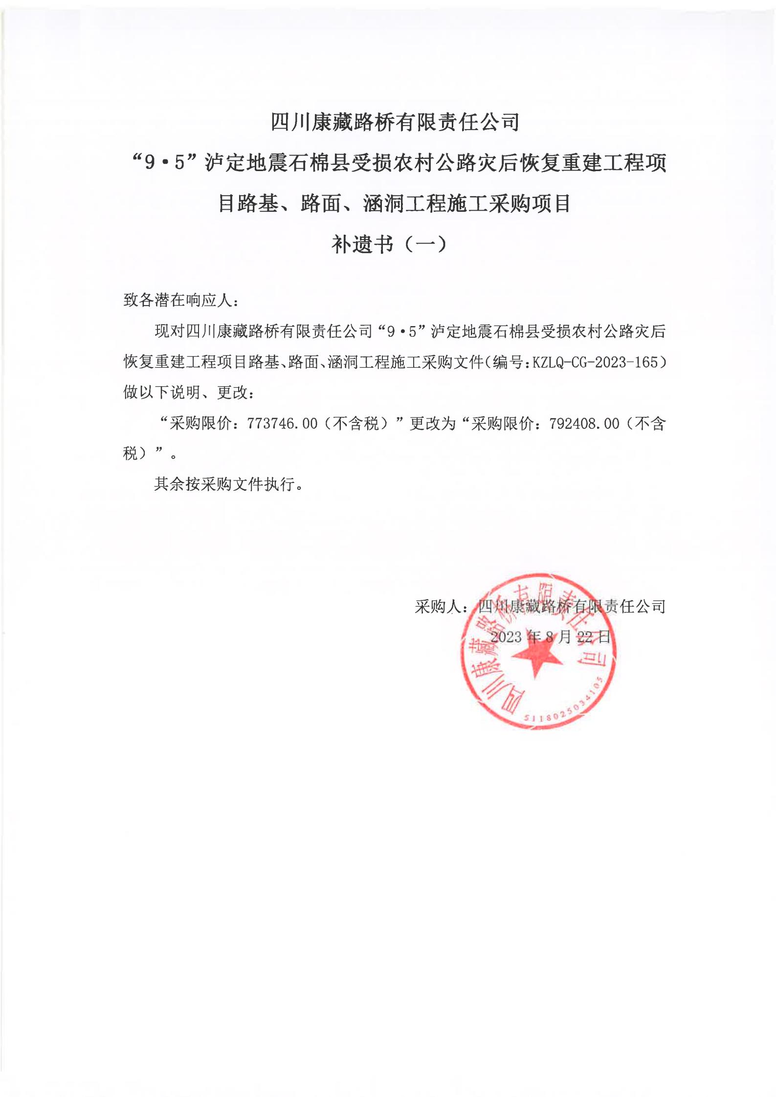 四川康藏路橋有限責(zé)任公司“9·5”瀘定地震石棉縣受損農(nóng)村公路災(zāi)后恢復(fù)重建工程項目路基、路面、涵洞工程施工采購項目補遺書(一)