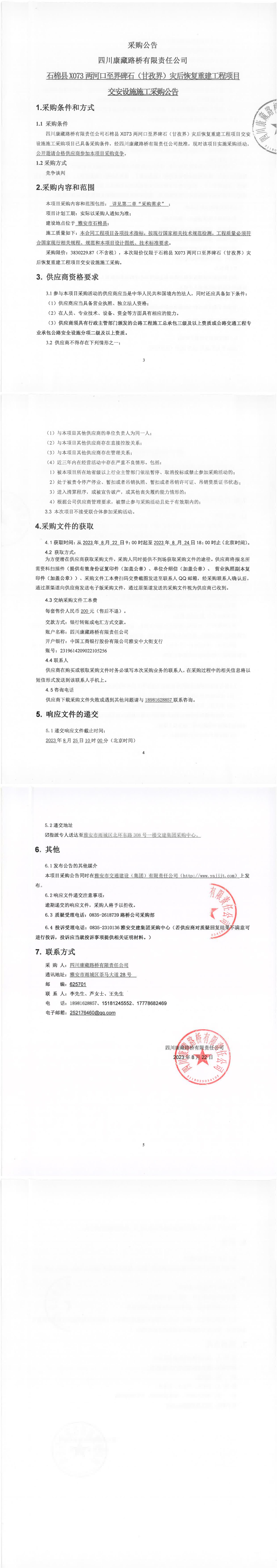 四川康藏路橋有限責(zé)任公司石棉縣X073兩河口至界碑石(甘孜界)災(zāi)后恢復(fù)重建工程項目交安設(shè)施施工采購公告