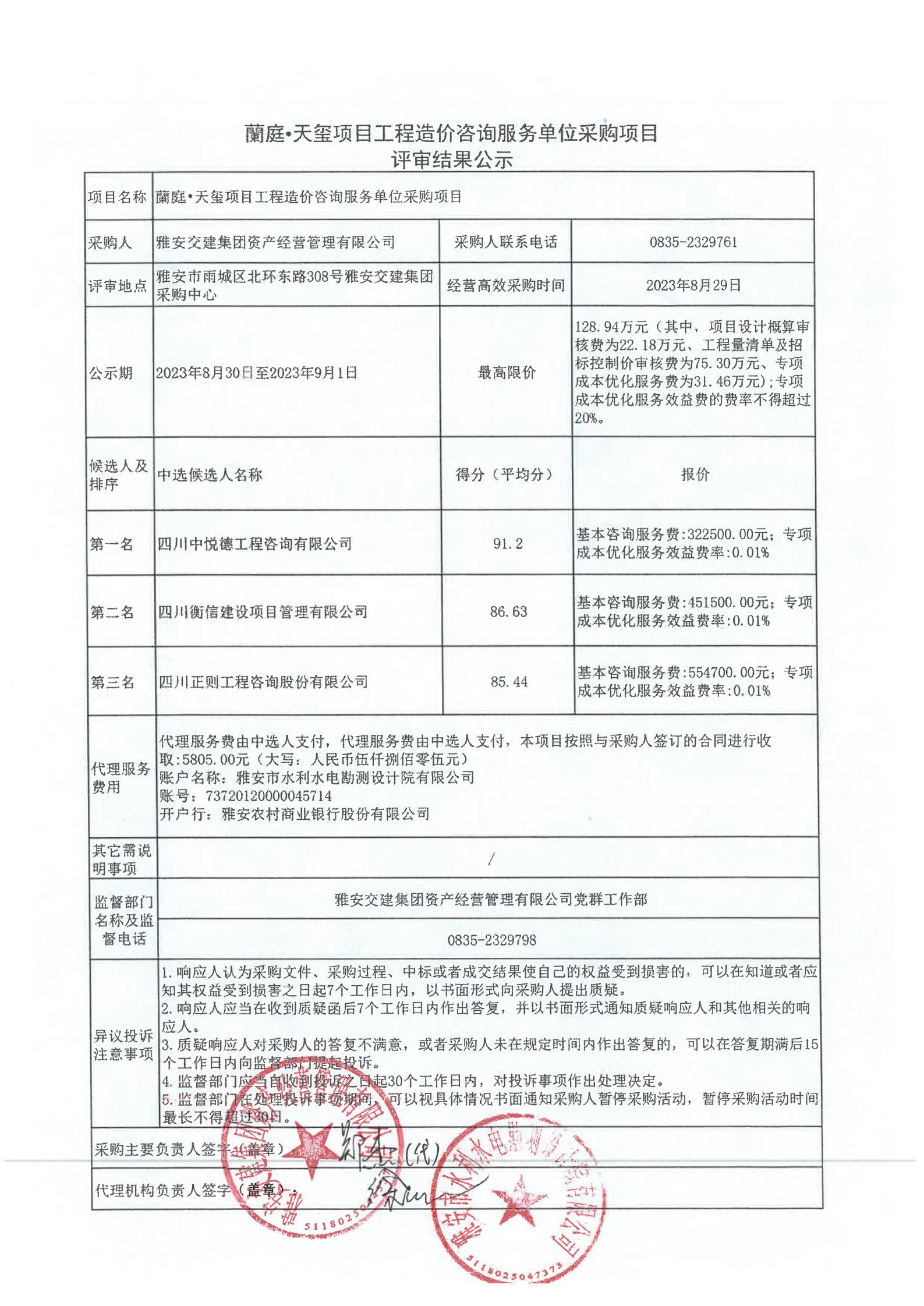 雅安交建集團資產(chǎn)經(jīng)營管理有限公司蘭庭·天璽項目工程造價咨詢服務(wù)單位采購項目評審結(jié)果公示