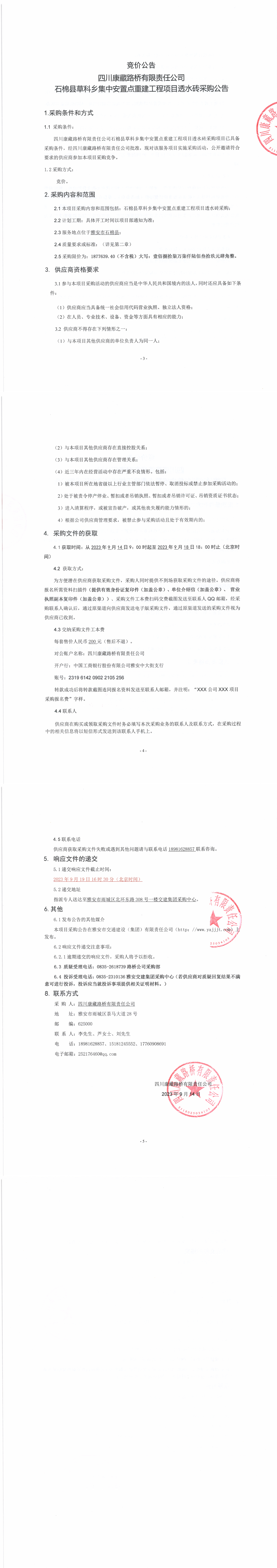 四川康藏路橋有限責任公司石棉縣草科鄉(xiāng)集中安置點重建工程項目透水磚采購公告