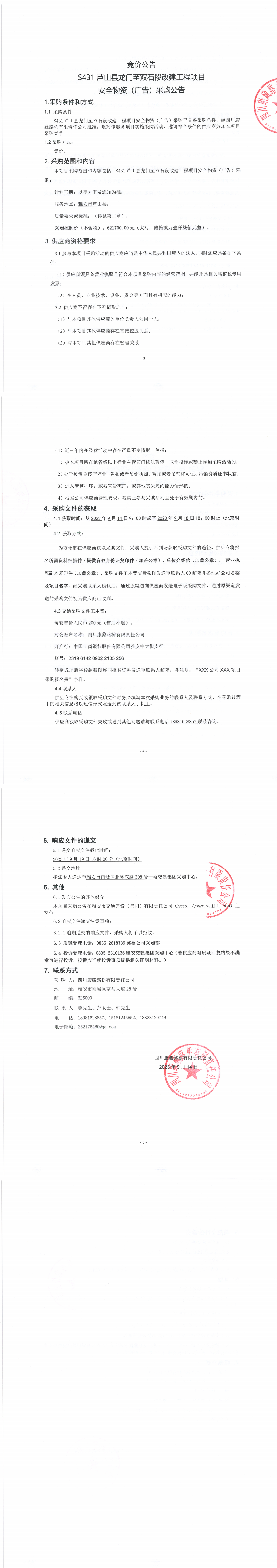 四川康藏路橋有限責(zé)任公司S431蘆山縣龍門至雙石段改建工程項目安全物資(廣告)采購公告