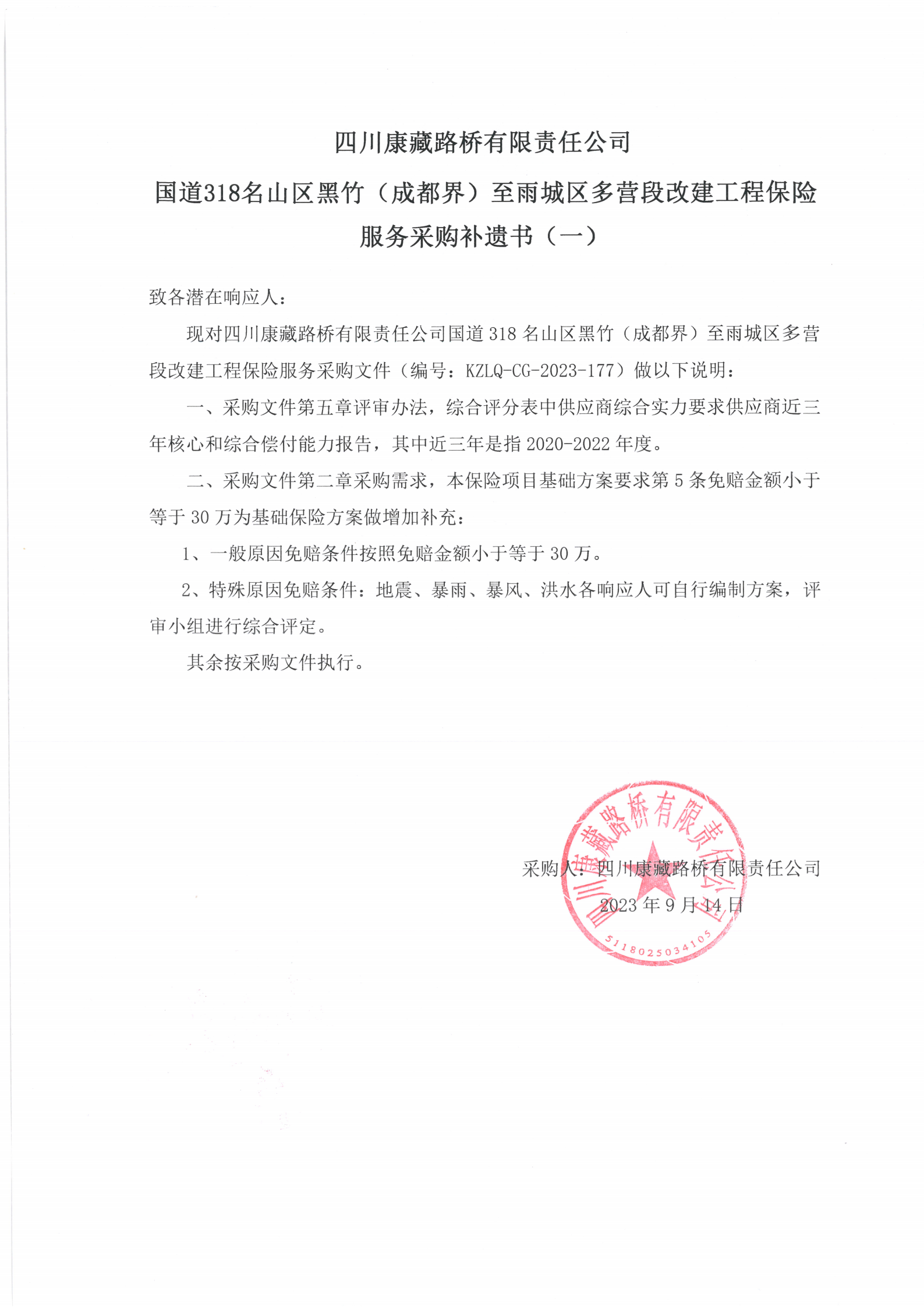 四川康藏路橋有限責(zé)任公司國(guó)道318名山區(qū)黑竹(成都界)至雨城區(qū)多營(yíng)段改建工程保險(xiǎn)服務(wù)采購(gòu)補(bǔ)遺書(shū)(一)