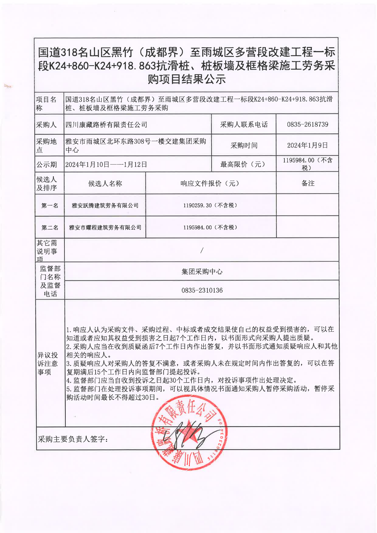 四川康藏路橋有限責(zé)任公司國(guó)道318名山區(qū)黑竹(成都界)至雨城區(qū)多營(yíng)段改建工程一標(biāo)段K24+860-K24+918.863抗滑樁、樁板墻及框格梁施工勞務(wù)采購項(xiàng)目結(jié)果公示