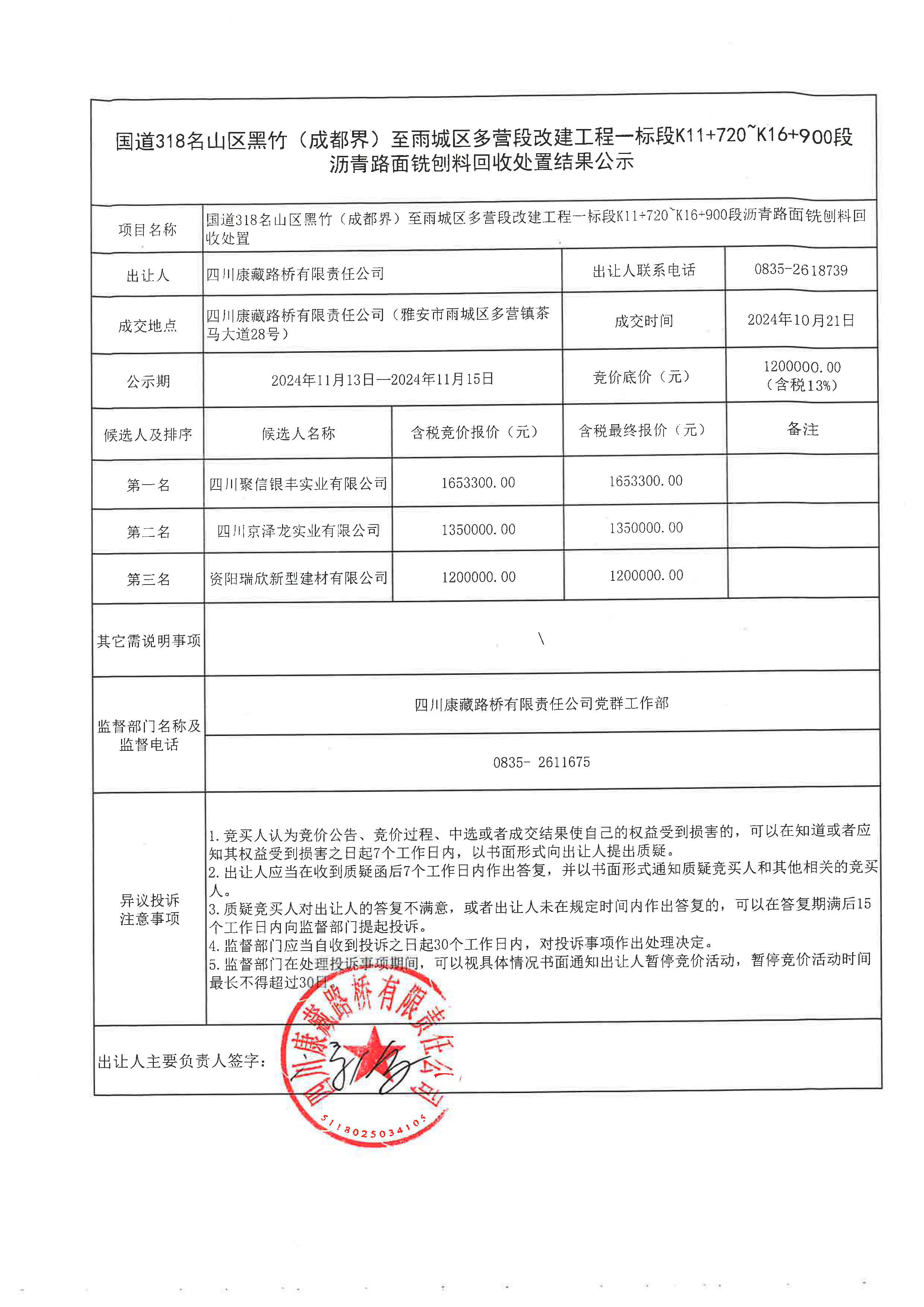 四川康藏路橋有限責(zé)任公司國道318名山區(qū)黑竹(成都界)至雨城區(qū)多營段改建工程一標段K11+720~K16+900段瀝青路面銑刨料回收處置結(jié)果公示