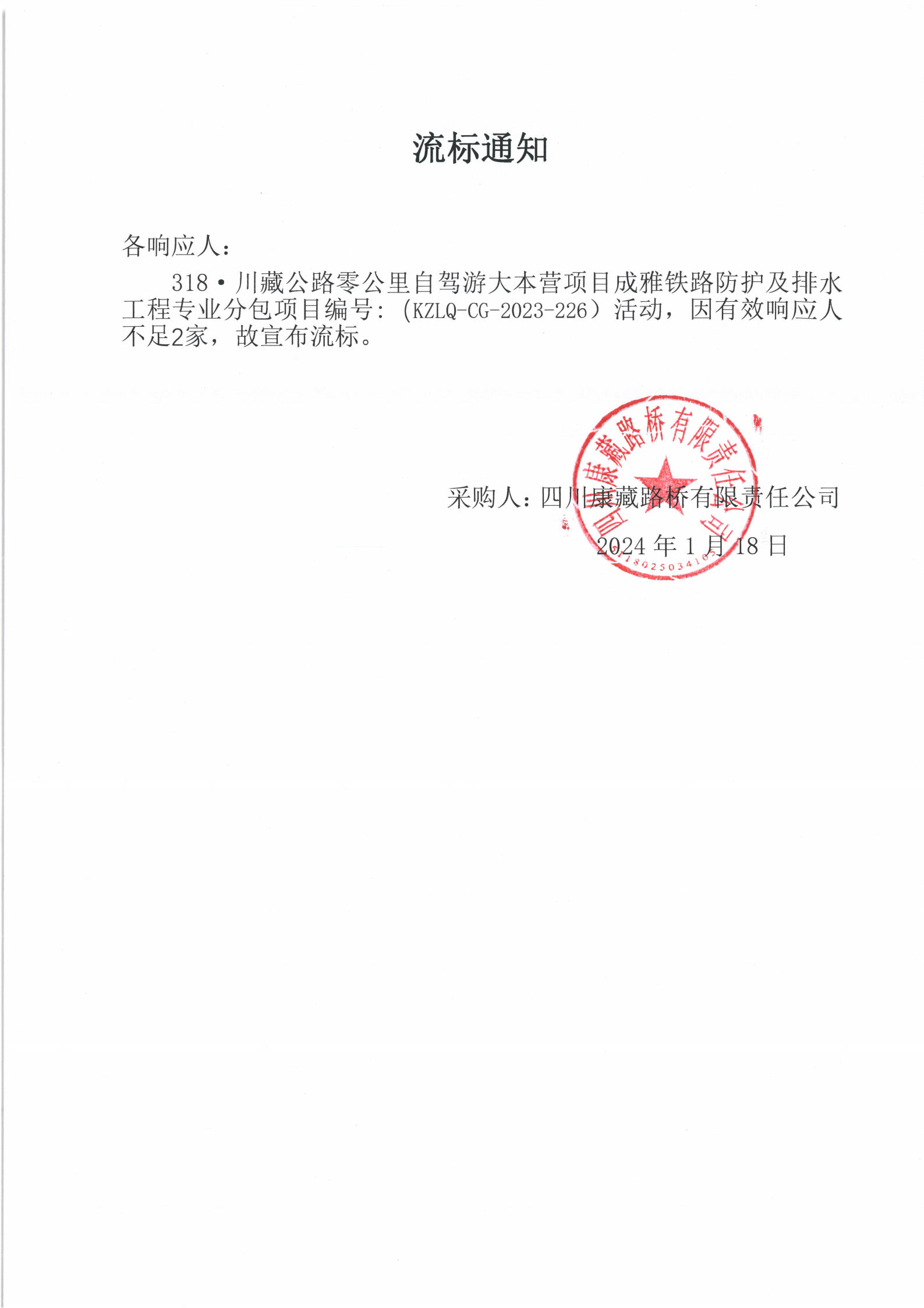 四川康藏路橋有限責(zé)任公司318·川藏公路零公里自駕游大本營項目成雅鐵路防護及排水工程專業(yè)分包項目流標(biāo)通知