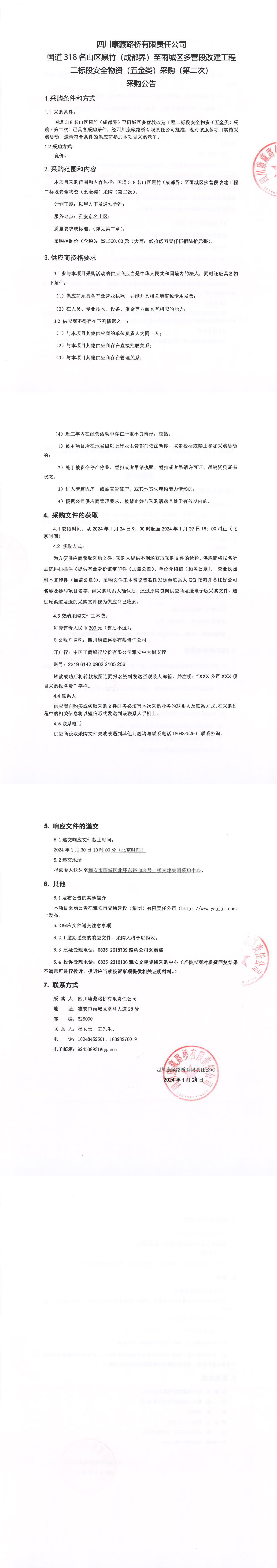 四川康藏路橋有限責(zé)任公司國道318名山區(qū)黑竹(成都界)至雨城區(qū)多營段改建工程二標(biāo)段安全物資(五金類)采購(第二次)采購公告