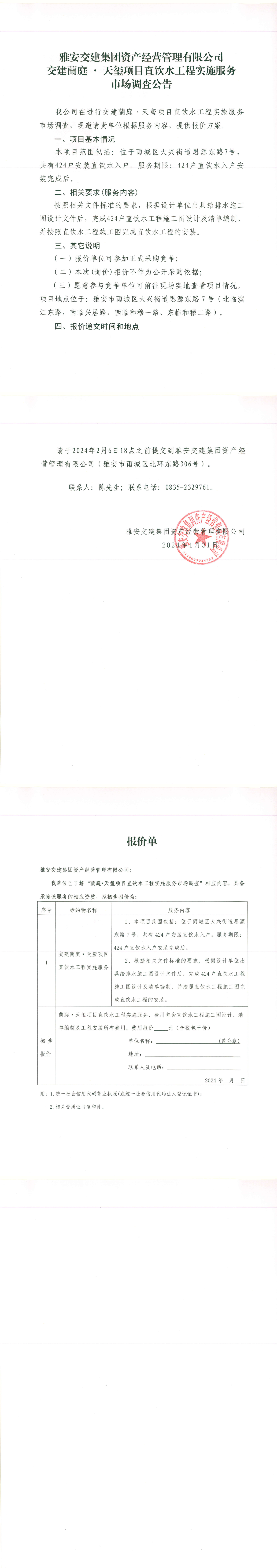 雅安交建集團資產(chǎn)經(jīng)營管理有限公司交建蘭庭·天璽項目直飲水工程實施服務(wù)市場調(diào)查公告